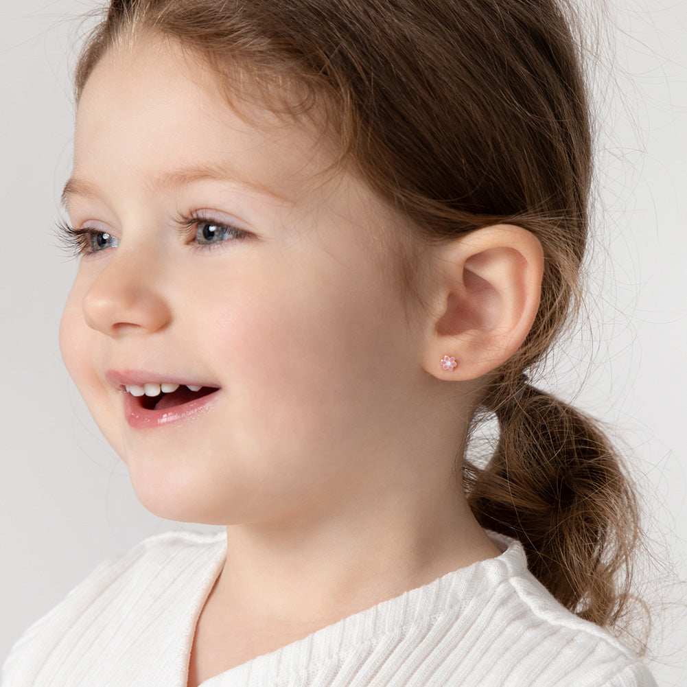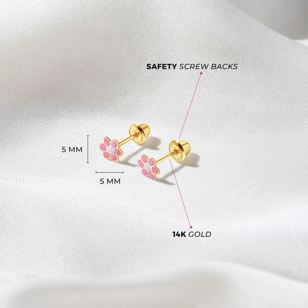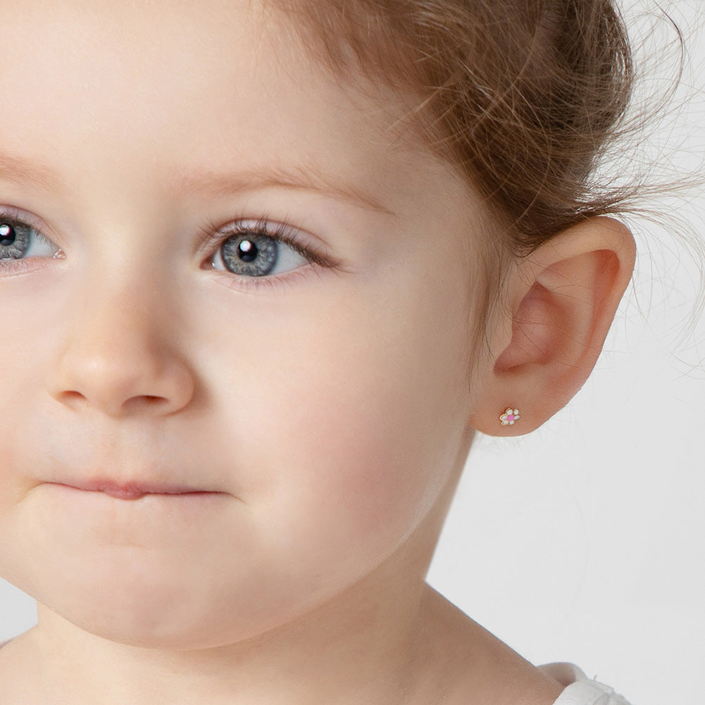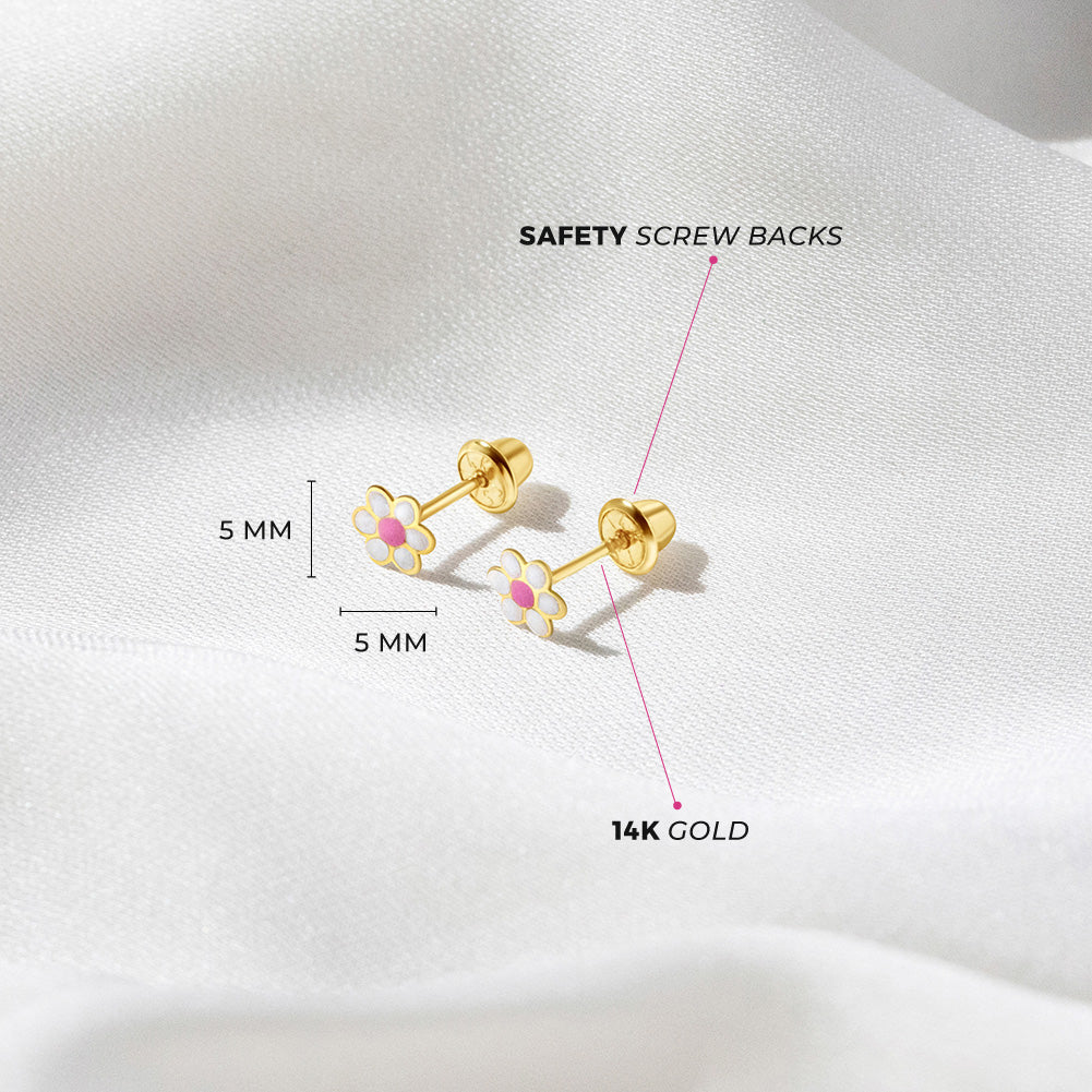 Your little girl will look precious with these adorable baby earrings made of 14k gold which are suitable for sensitive ears. Featuring a cute daisy flower colored with bright enamel colors, leading to a post with safety screw backs for children. These gold flower earrings make a perfect gift for any special occasion such as holidays or birthdays. A complimentary gift box is included for your convenience.