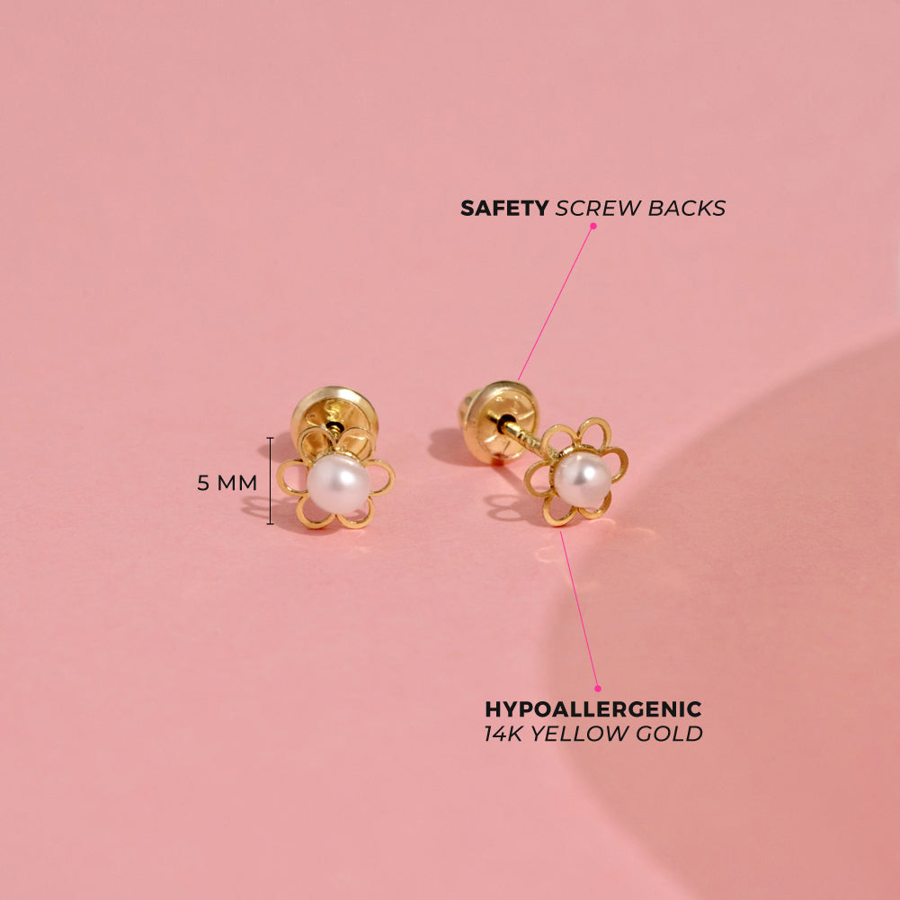 These cute white freshwater cultured pearl flower screw backs will look adorable on your little girls! Designed with 14k yellow gold flower shape, these earrings are set with creamy white cultured pearls at the center. These screw-back earrings are suitable for sensitive ears and are adorable design that is sure to delight any young girl. Comes in with a beautiful gift box, making them easy and convenient to gift for any special occasion. Pair these precious 14k gold flower earrings with any toddler outfit for a cute and fashionable look.