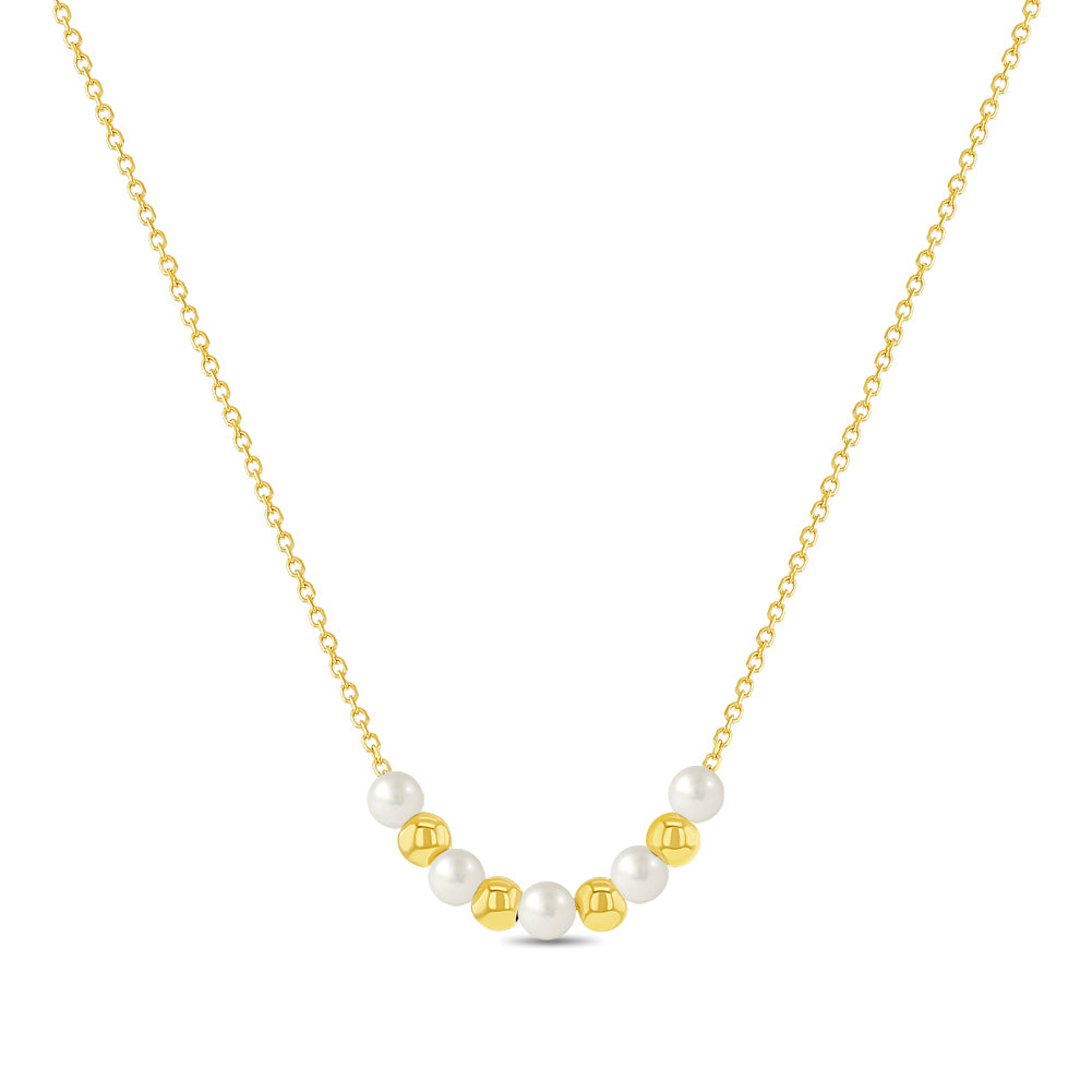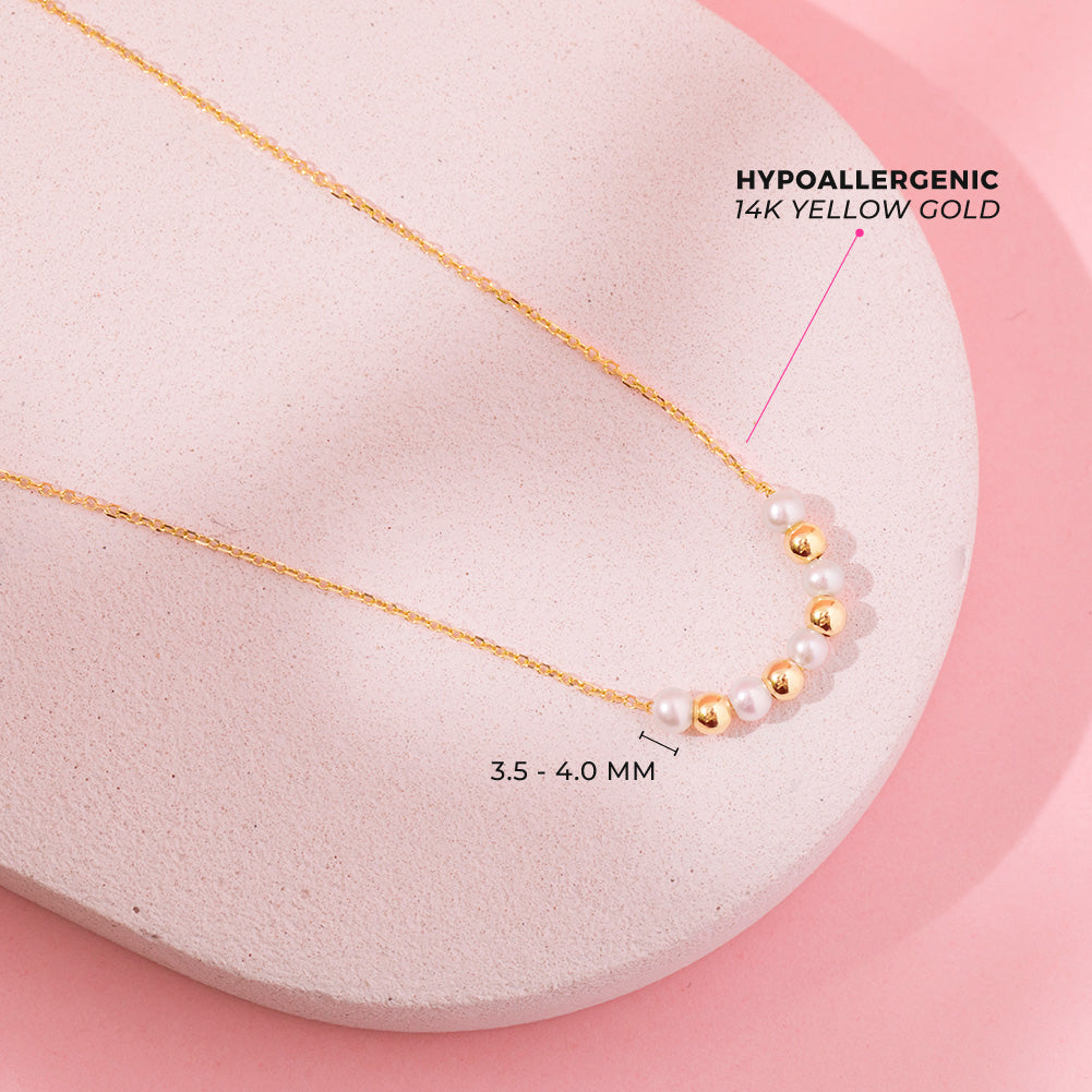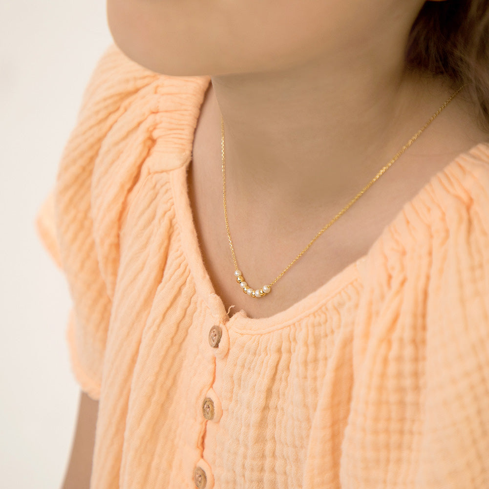 A delicate link chain necklace that is beautifully adorned with small freshwater cultured pearls stranded with polished balls within. Any little girl will love to receive this adorable necklace to wear to formal occasions or for daily wear. This beautiful necklace is crafted from 14k yellow gold, and it is great for girls with sensitive skin. Gift box is included with purchase.