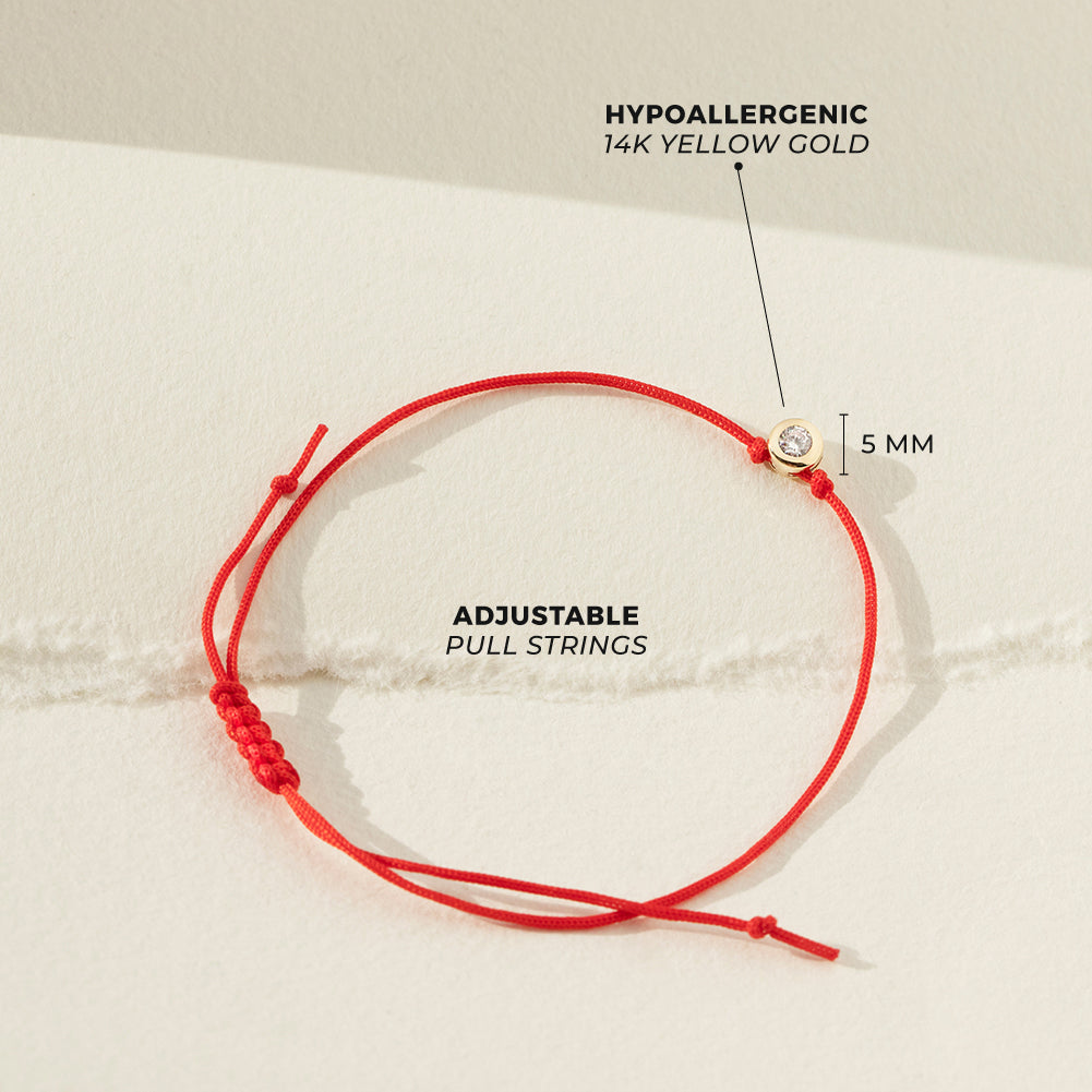 Designed with sophistication and elegance in mind. Crafted to perfection, this stunning bracelet features a radiant halo around a set cubic zirconia stone set in lustrous 14k gold, adding a touch of timeless glamour to any outfit. The adjustable red string ensures a comfortable and customizable fit, making it the perfect accessory for any occasion.