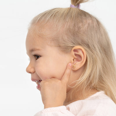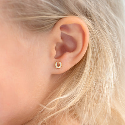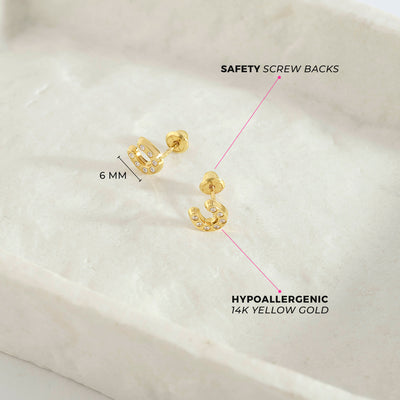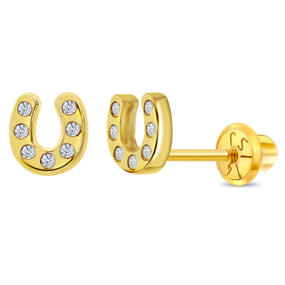 These darling 14k yellow gold pair of horseshoe earrings, are specially crafted for the little girls in your life. Adorned with delicate clear cubic zirconia stones throughout, these earrings add a much needed sparkle to any ensemble. Crafted with the utmost care, they are designed with the sensitive ears of young girls in mind, ensuring both style and comfort. The screw back closure provides added security, ensuring that these precious earrings stay safely in place, great for all-day wear. Let your little one shine bright with these charming and timeless treasures. A gift box is included for an easier gifting experience.