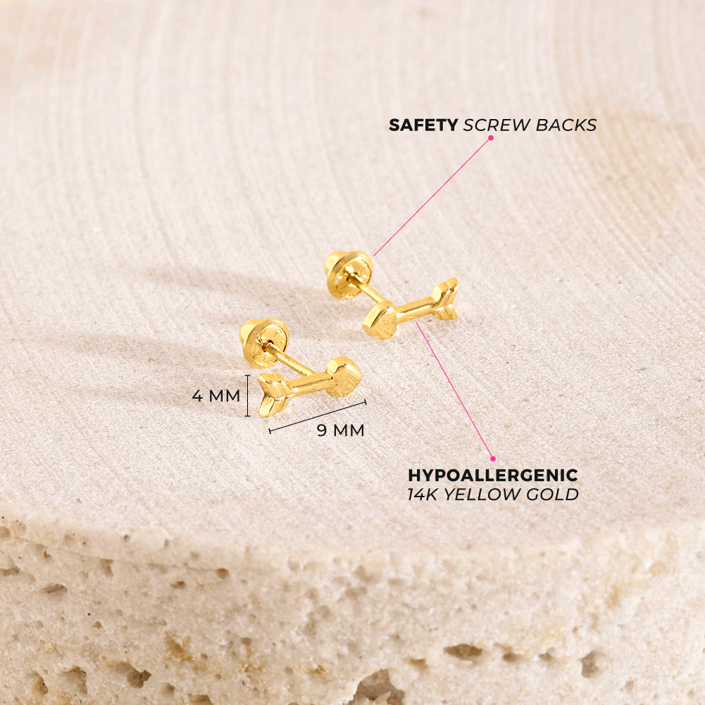 Dainty and playful, these arrow-shaped earrings are a whimsical addition to any little girl's jewelry collection. Crafted from 14k yellow gold, they're not only stylish but safe for sensitive ears. Each arrow is adorned with sweet hearts at the ends, adding a touch of charm to her daily outfits. The safety screw back closure ensures they stay securely in place, allowing for worry-free wear during playtime or special occasions. A delightful gift for any young girl, these earrings come packaged in a cute and colorful box, ready to bring joy and sparkle to her day.