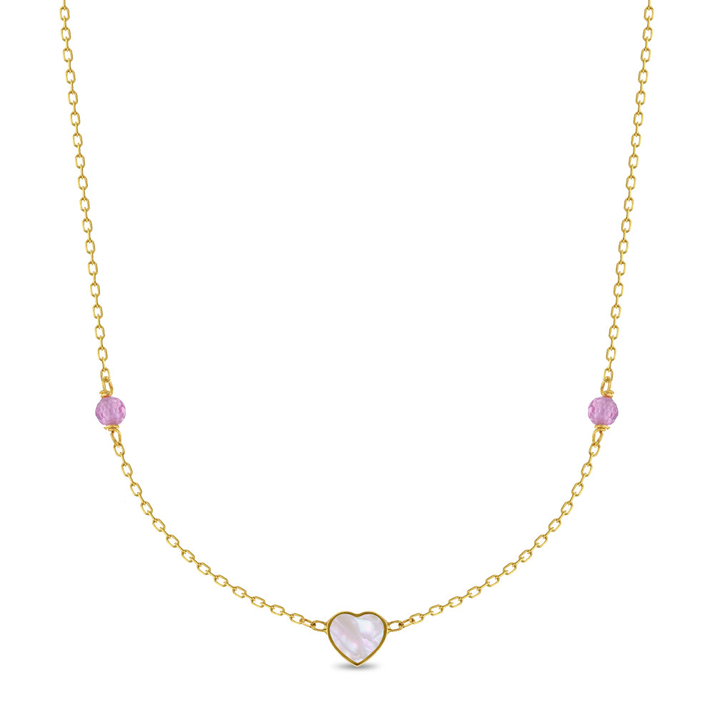 Sweet and sentimental, this mother of pearl heart necklace is a lovely piece for any young girl. Made from 14k yellow gold, it features a luminous mother of pearl heart pendant at the center, surrounded by two delicate pink crystals for a soft look. The 15-inch chain includes a 1-inch extender, offering a comfortable fit that grows with her. For birthdays, special occasions, or just because, this necklace is a timeless keepsake she'll treasure. A gift box is included with purchase.