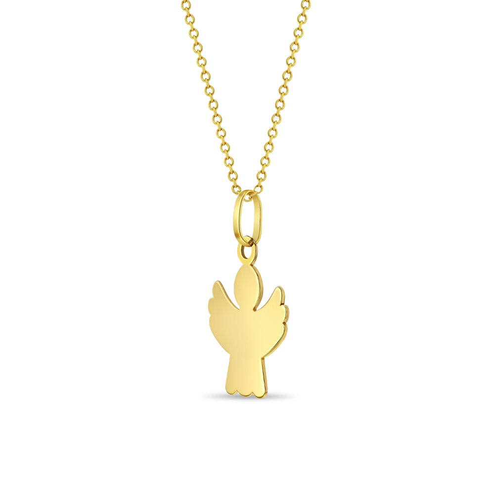 Celebrate your little girls religious milestone with this beautiful engravable Angel pendant. A polished angel that can easily be engraved to feature your little girls name or the date of her special communion or religious event. This beautiful angel pendant is crafted finely from a 14k yellow gold, and is safe for young girls who have sensitive skin types. A matching chain is included with this stunning pendant. Packed into a sweet gift box for easy gifting.