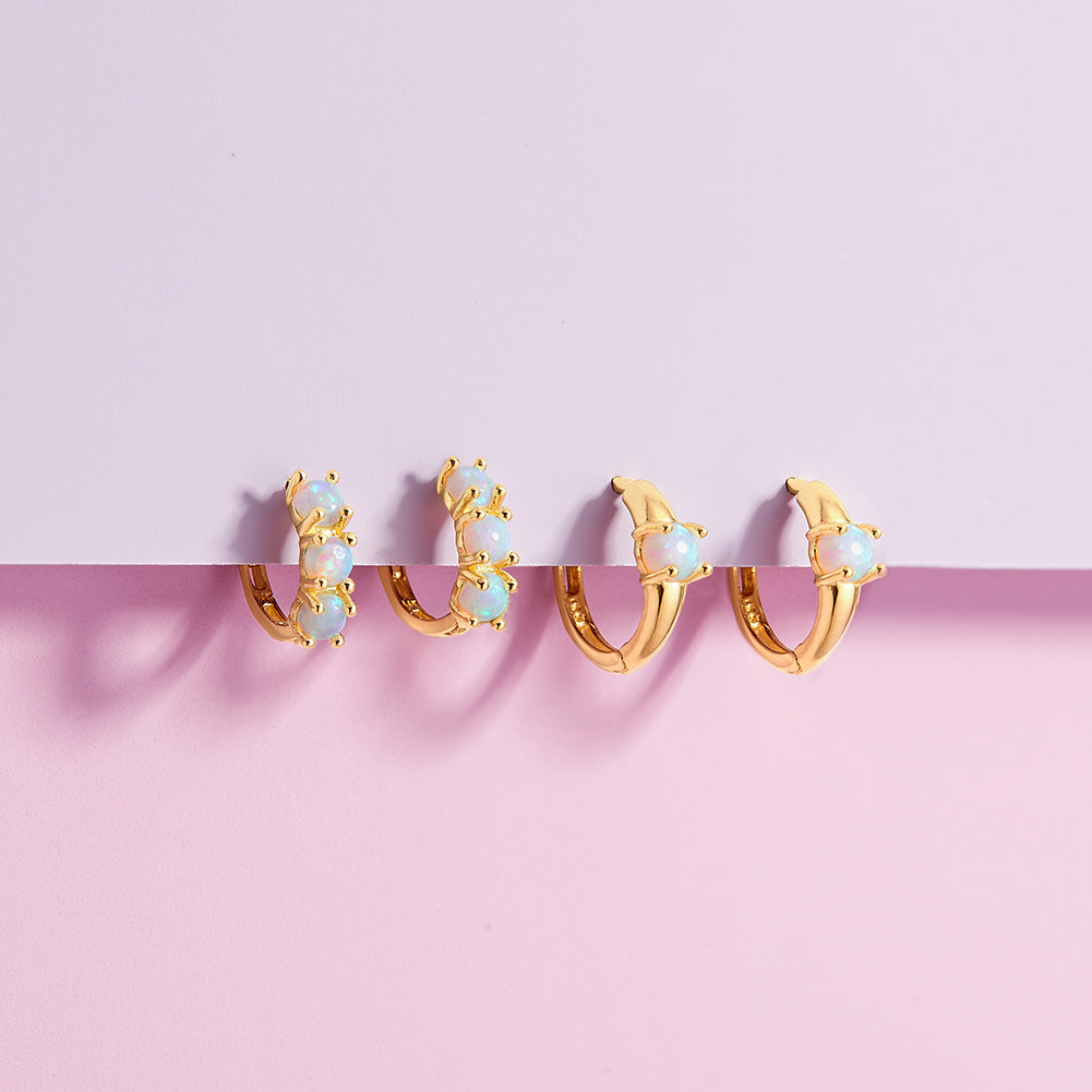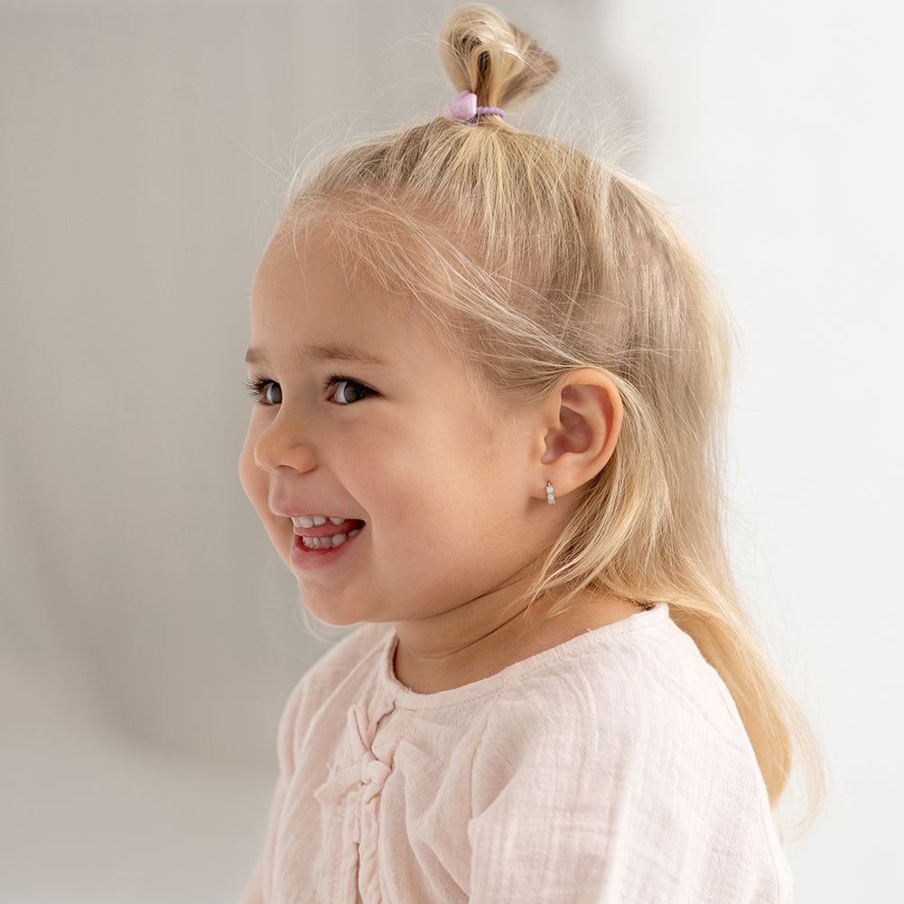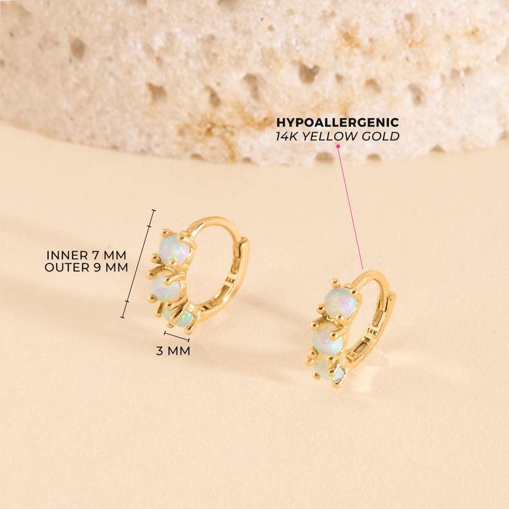 Enhance your little one's charm with these dainty hoop earrings crafted from 14k yellow gold, designed specifically for girls with sensitive skin. Measuring a delicate 7mm inner diameter, these earrings boast a timeless elegance. Adorning the front are three prong-set simulated opal stones, adding a touch of sparkle to any ensemble. For everyday wear or special occasions, these earrings effortlessly blend style and comfort, making them an ideal addition to any young girls jewelry collection. Gift box included with purchase.
