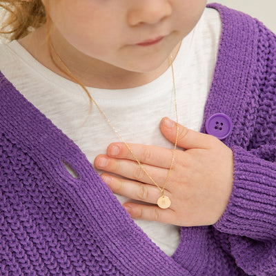 This sweet and tiny medal pendant is a lovely detail for a little girl that can easily be engraved with her initial. A dainty medal that is finely crafted from 14k yellow gold. Add your little ones initials to this classic pendant to create a special gift they will treasure for years to come. This pendant can be added to her favorite chain necklaces. Gift box included with purchase.
