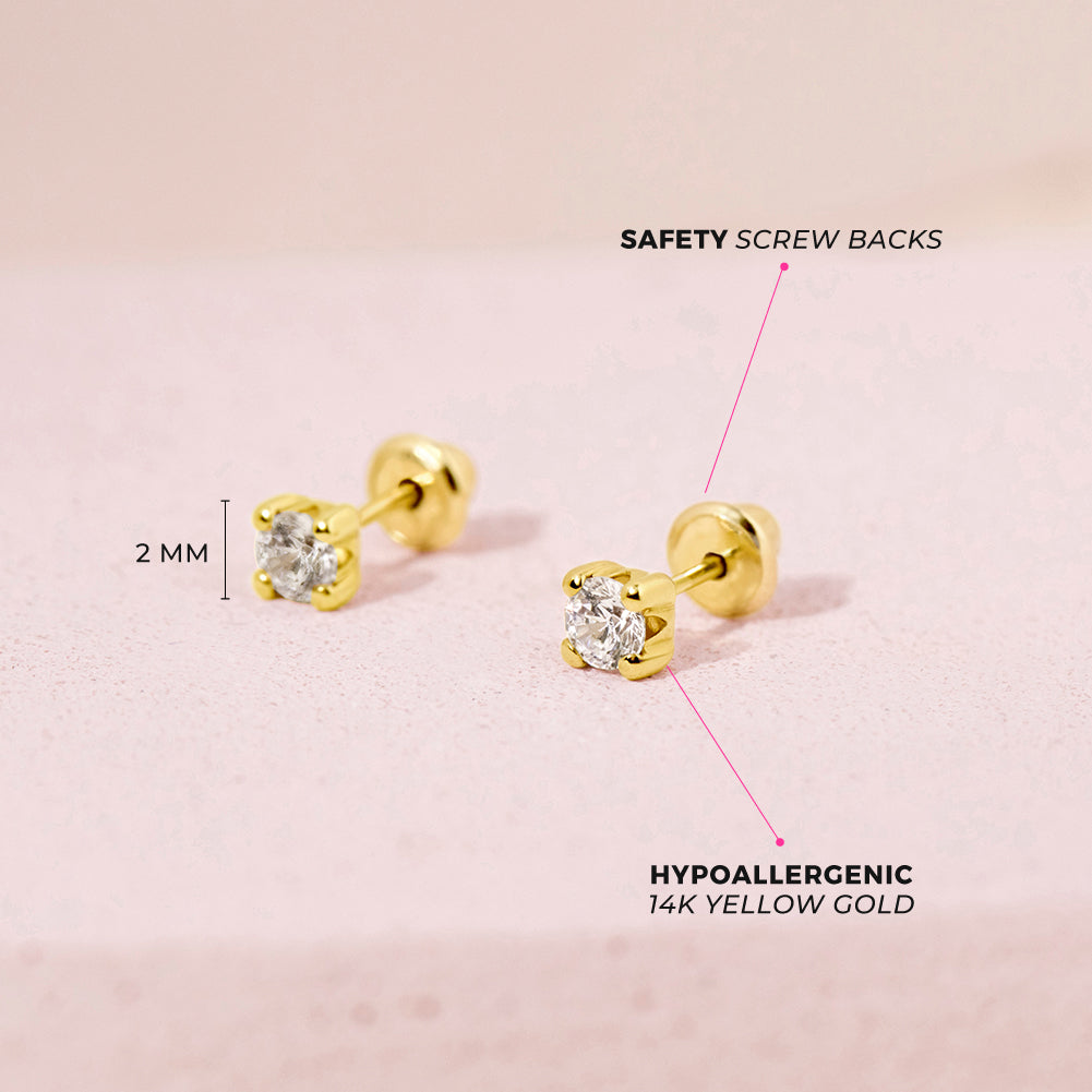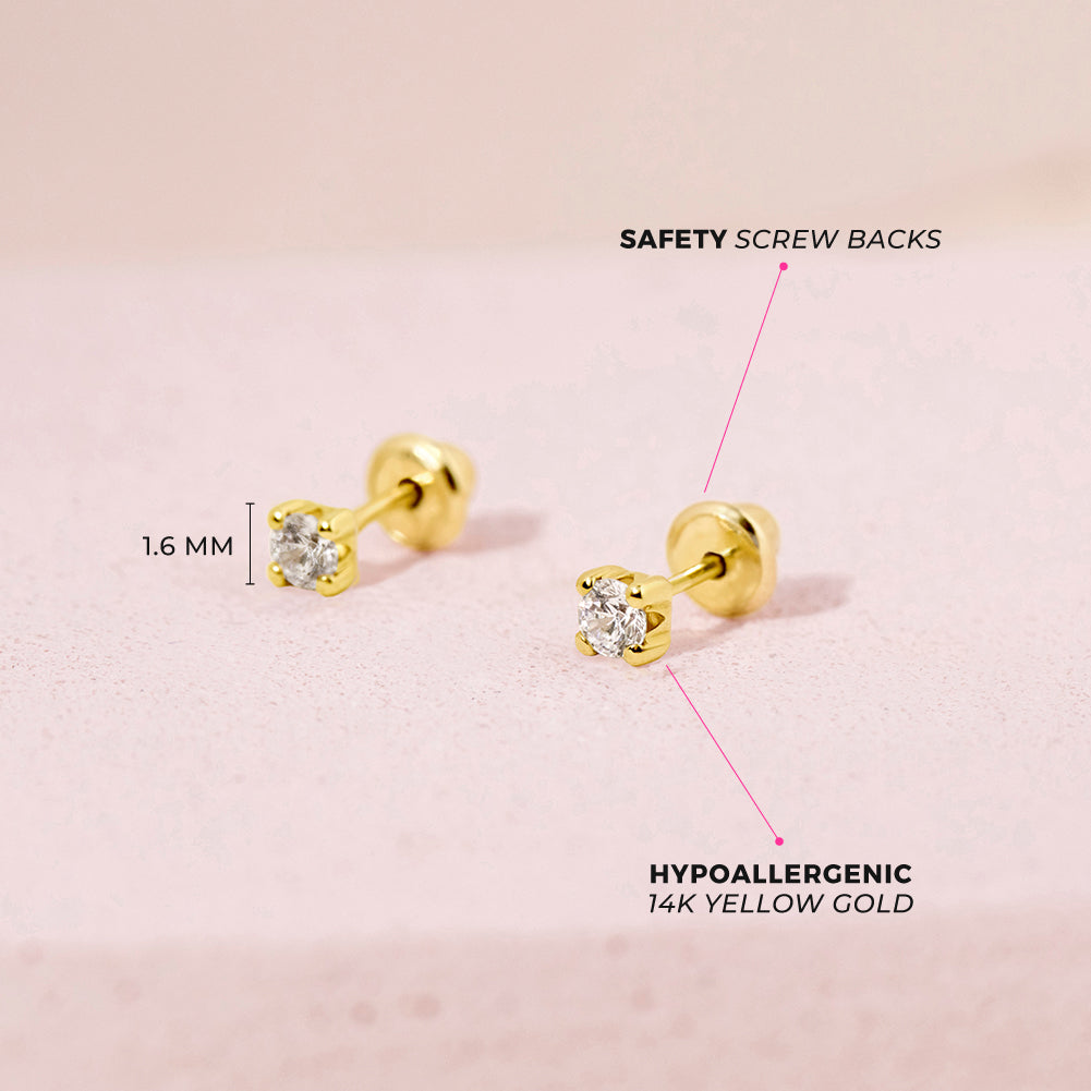 These dainty prong set diamond earrings are a wonderful accessory for your baby girl. Made from high-quality 14k yellow gold, they are safe for sensitive skin. Featuring a diamond at the center, these prong-set earrings sparkle beautifully in the light. The screw-back closure ensures a secure fit, so you can be confident that your little one's earrings will stay in place. These timeless and elegant earrings make a great gift for a baby shower, christening, or any special occasion. With their classic design and high-quality materials, they are sure to become a treasured keepsake for years to come. Gift box is included with purchase.