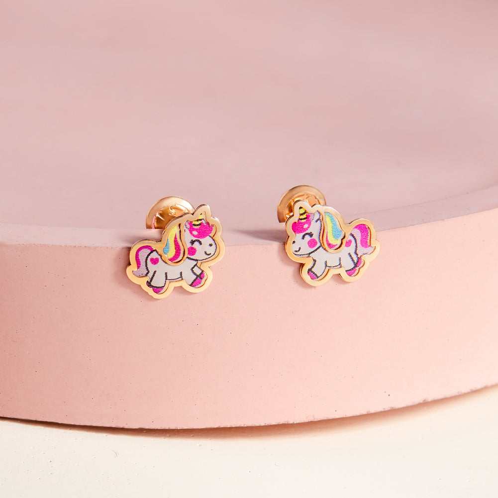 Each earring has magic! Delightful and dainty, these sparkling multicolor enamel unicorn screw back earrings are just her fairy-tale style. Beautifully crafted in 14k yellow gold, a precious material which is suitable for young girls with sensitive skin. Order a sweet unicorn pair today and we'll package these earrings into their little gift box.