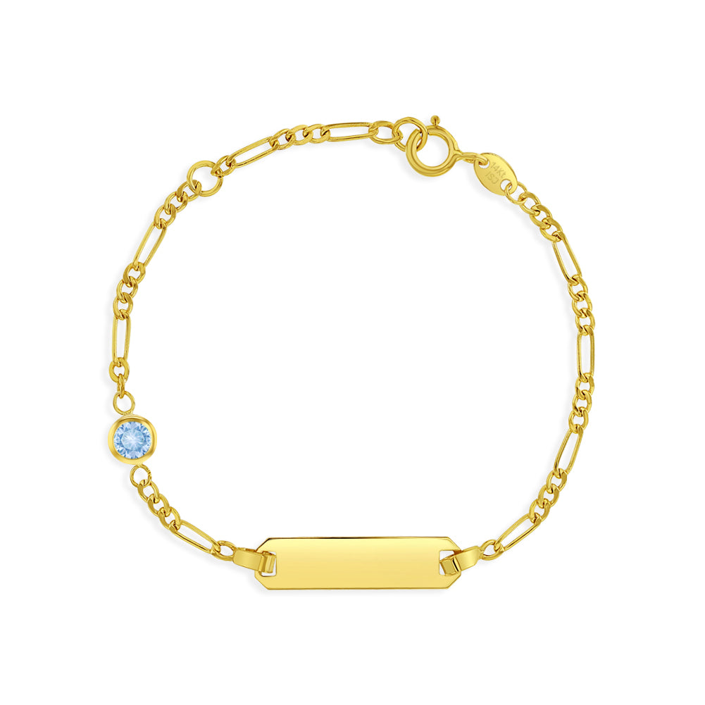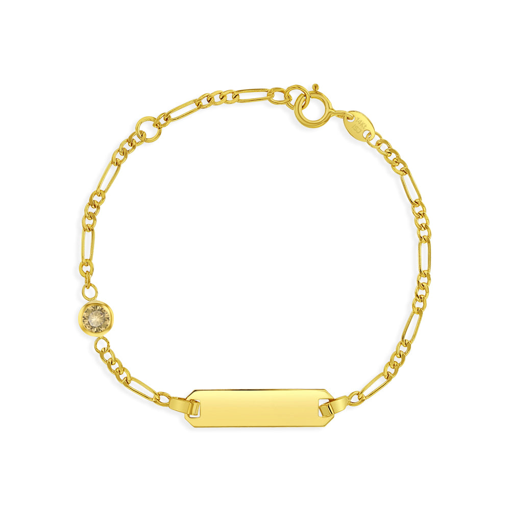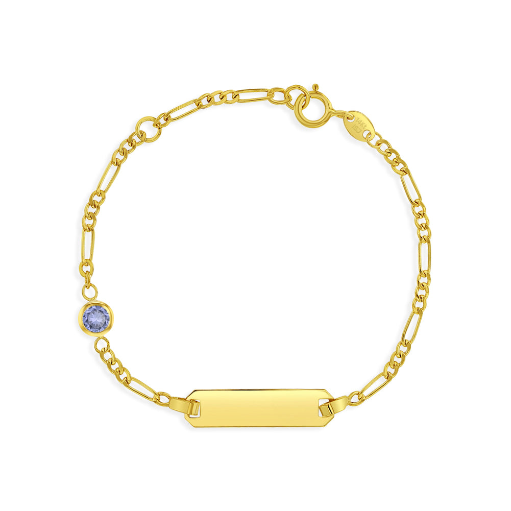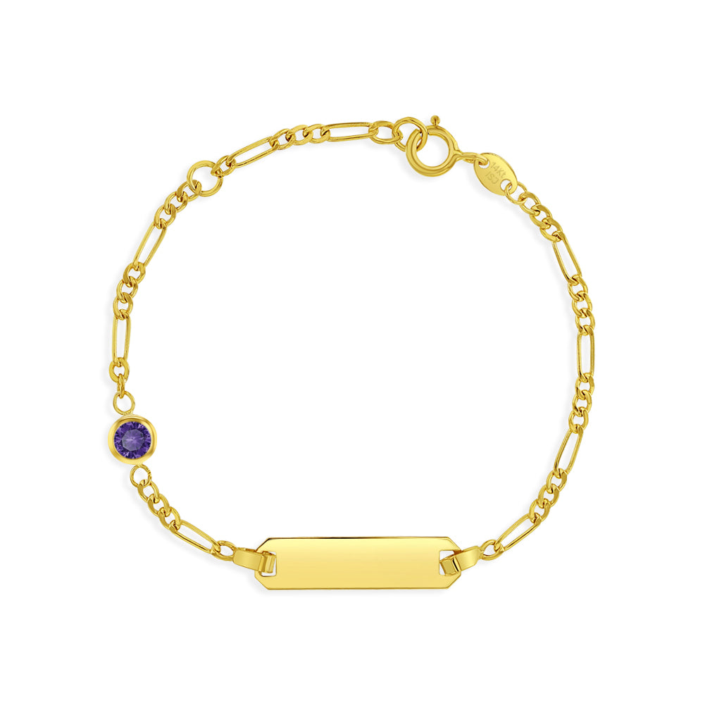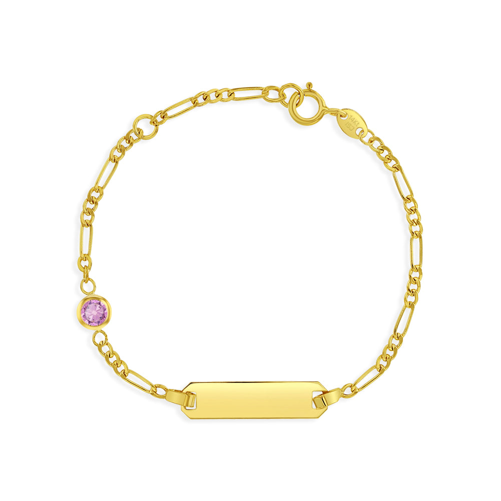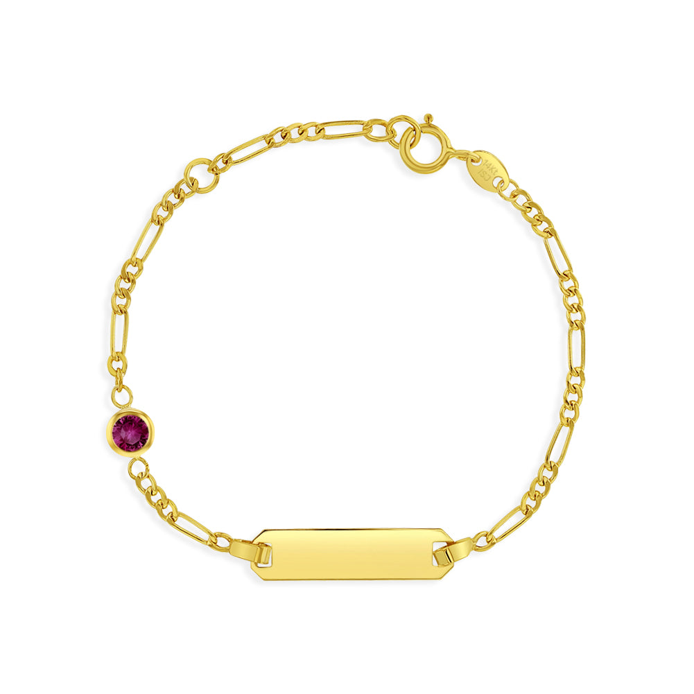 This beautiful baby or toddler girl's engravable identification bracelet is a lovely keepsake for your little one. Crafted from high-quality 14k yellow gold, it features a stunning simulated birthstone on the side. The cubic zirconia stone adds a charming touch, making the bracelet even more special and personalized for your baby. With space for engraving, it becomes a unique and meaningful accessory that will be cherished for years to come. Ideal for gifting on special occasions, this bracelet combines elegance and sentiment in a timeless piece. A gift box is included with your purchase.