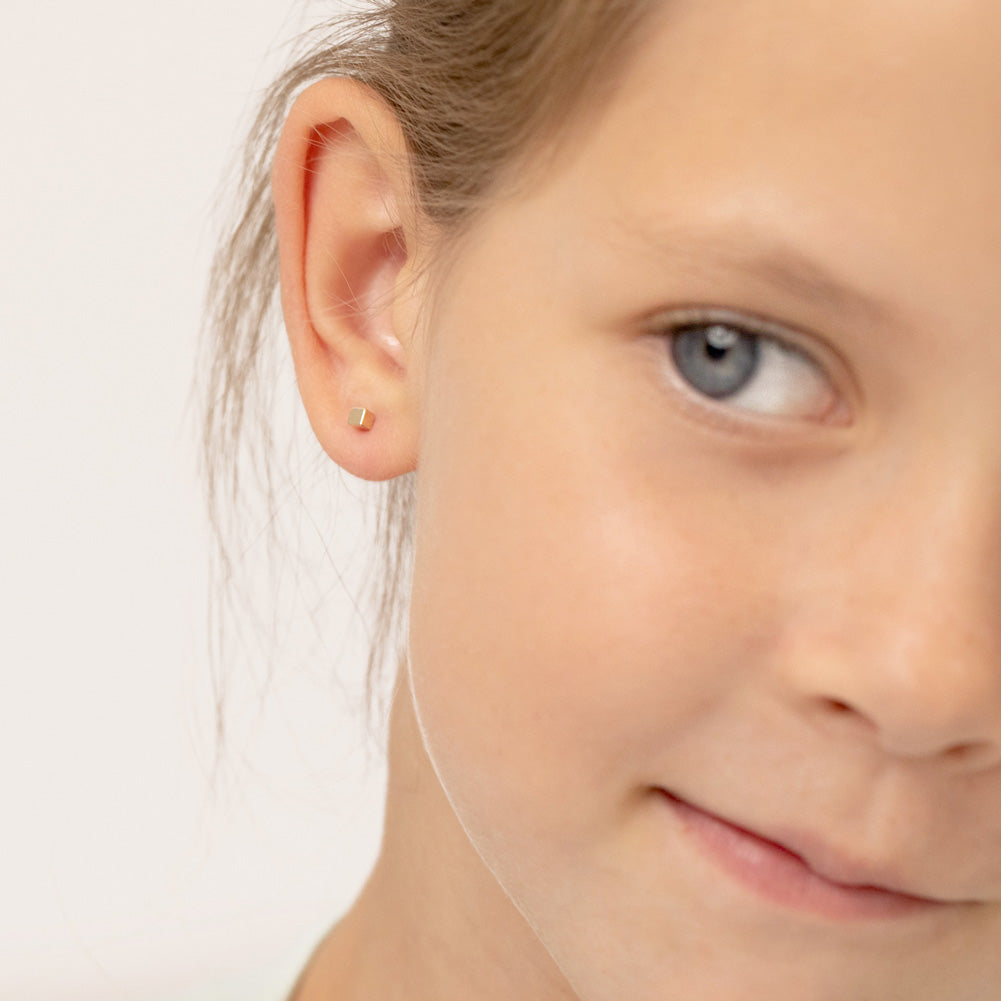 Introducing a stylish and petite addition to a little girl's jewelry collection, these 14k yellow gold earrings boast a charming cubed shape. Designed to stun, these tiny earrings exude elegance and sophistication. With the added assurance of safety, thanks to their secure screw back closures, these earrings offer both style and comfort. A delightful choice for any fashion-forward young girl who appreciates exquisite craftsmanship in a compact package. Gift Box included.