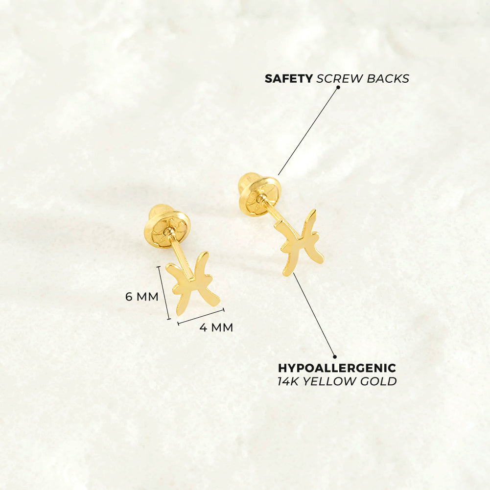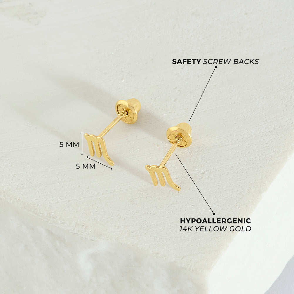 Our sweetest women's zodiac sign earrings, crafted from 14k yellow gold to represent each of the twelve zodiac signs. These elegant earrings are perfect for adding a personal touch to any outfit, whether you choose to wear your own sign or that of a loved one. Designed to fit comfortably in extra piercings, they come equipped with safety screw backs to ensure a secure and comfortable fit throughout the day. Embrace the stars with these timeless pieces.