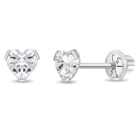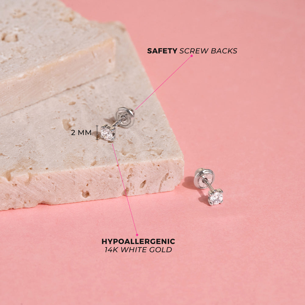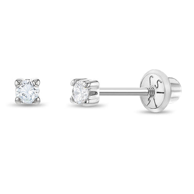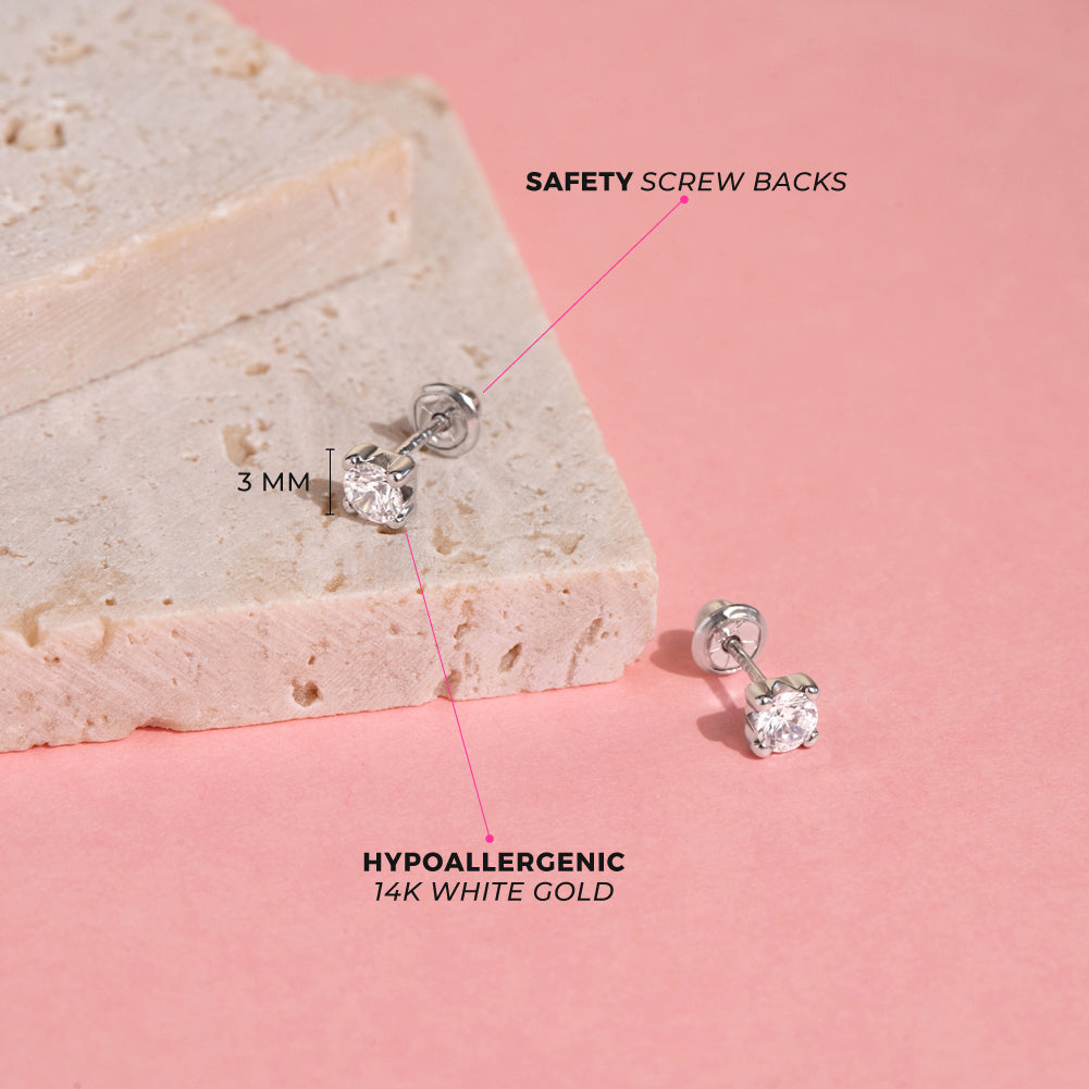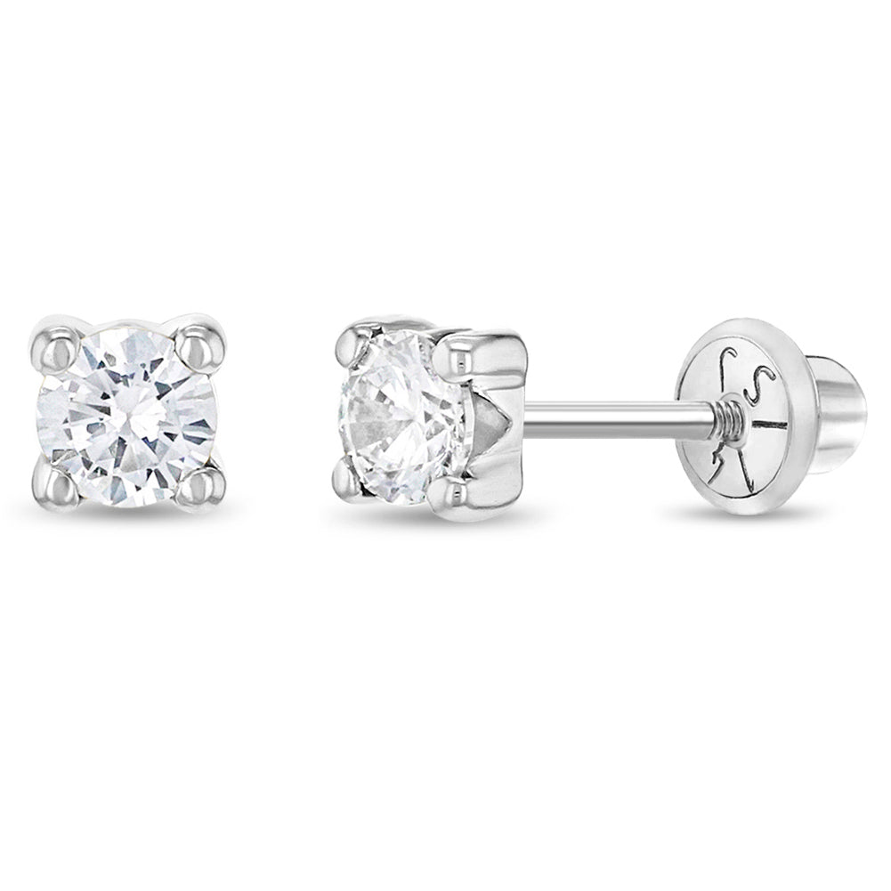 These screw back earrings for girls are simple and striking which will add a glam look to your little girl's fashionable outfits. These four prong set solitaire earrings have safety backs for an extra comfort and security. They are made of 14k white gold which are suitable for children with sensitive ears. These screw back earrings feature a beautiful and sparkly clear cubic zirconia. A complimentary gift box is included.