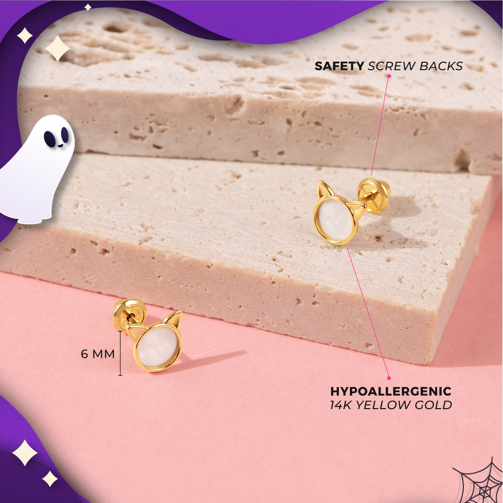 Looking for the perfect 14k earrings for the little cat lover in your life? These adorable 14k gold kitty earrings for little girls are sure to fit the bill! Crafted of solid 14k gold and natural mother of pearl, these toddler earrings are safe for children with sensitive ears. Featuring a unique safety screw back system, the threaded earrings posts and threaded earring back help to ensure your little girl's 14k gold cat earrings will stay safely and comfortably in place. Giving these 14k gold safety back earrings as a gift? A complimentary gift box is included!