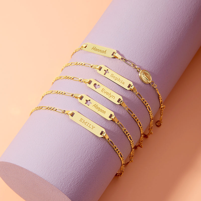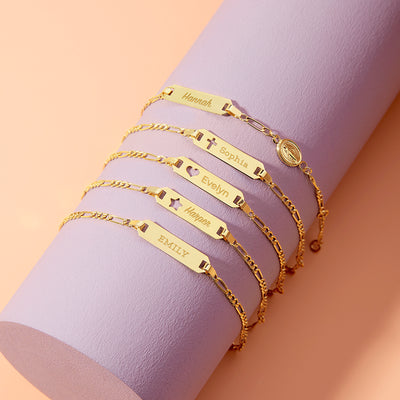 A symbol of faith and elegance for your child's wrist, this 18k yellow gold bracelet is a precious adornment crafted with utmost care. Designed with a dainty 4.5-inch chain, suited for little wrists, and complemented by an additional 1-inch extension, ensuring a comfortable fit as your child grows. The highlight of this bracelet is its engravable tag, featuring a delicate cross cut-out detail, symbolizing hope and devotion. Beyond its aesthetic charm, this tag serves as a personalized identifier, offering peace of mind to parents. Whether engraved with initials, a significant date, or a heartfelt message, this bracelet becomes a cherished keepsake, celebrating both faith and family.