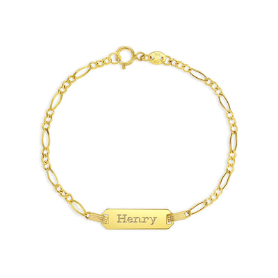 Embrace the timeless charm of an engravable tag ID bracelet designed for baby boys, accentuated by an elegant figaro chain. This bracelet is meticulously crafted from genuine 18k yellow gold, ensuring safety and comfort for your little one's sensitive skin. A classic and refined choice, this bracelet is the perfect gift for celebrating a baby or toddler's special birthday. Rest assured, your purchase includes a gift box, adding an extra touch of thoughtfulness to this beautiful keepsake.