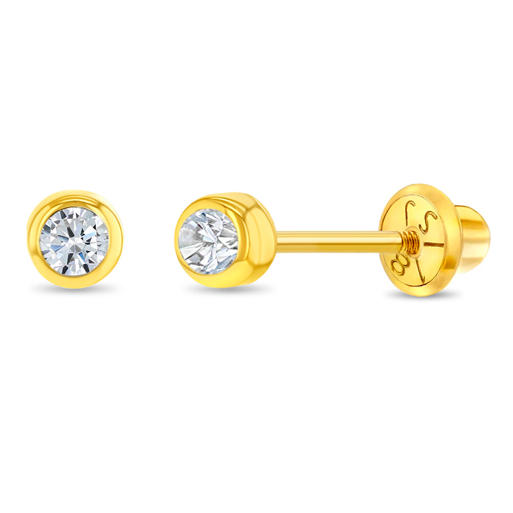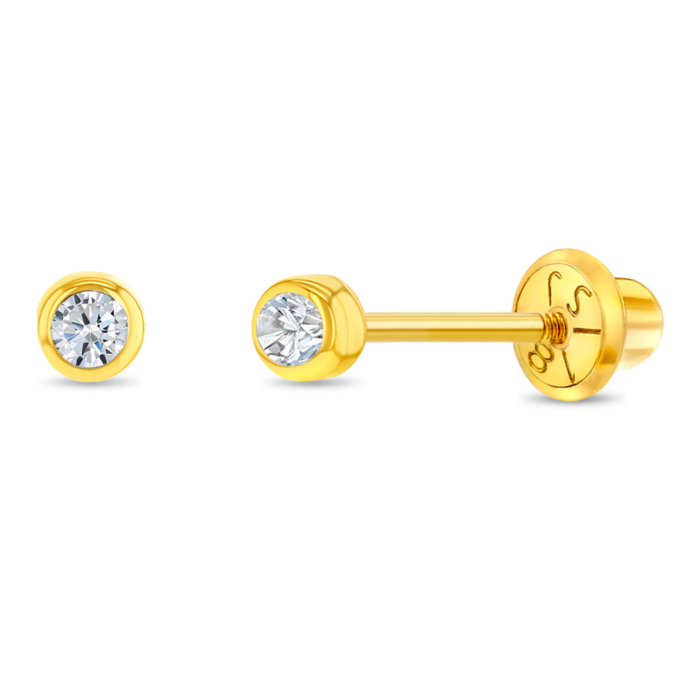 Our bezel set diamond earrings are the sweetest accessory for baby girls. Crafted from high-quality 18k yellow gold, these earrings are safe for sensitive skin. The small diamond at the center of each earring adds just the right amount of sparkle, making them an elegant choice for any occasion. The screw back closure ensures that the earrings stay securely in place, making them a practical choice for active babies and toddlers. These earrings are a timeless and beautiful gift that can be treasured for years to come. Give the gift of timeless elegance with our bezel set diamond earrings for baby girls. A small gift box is included with purchase.