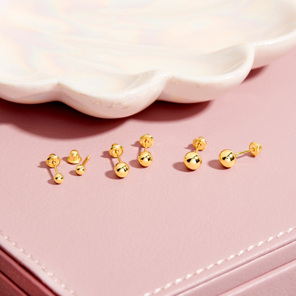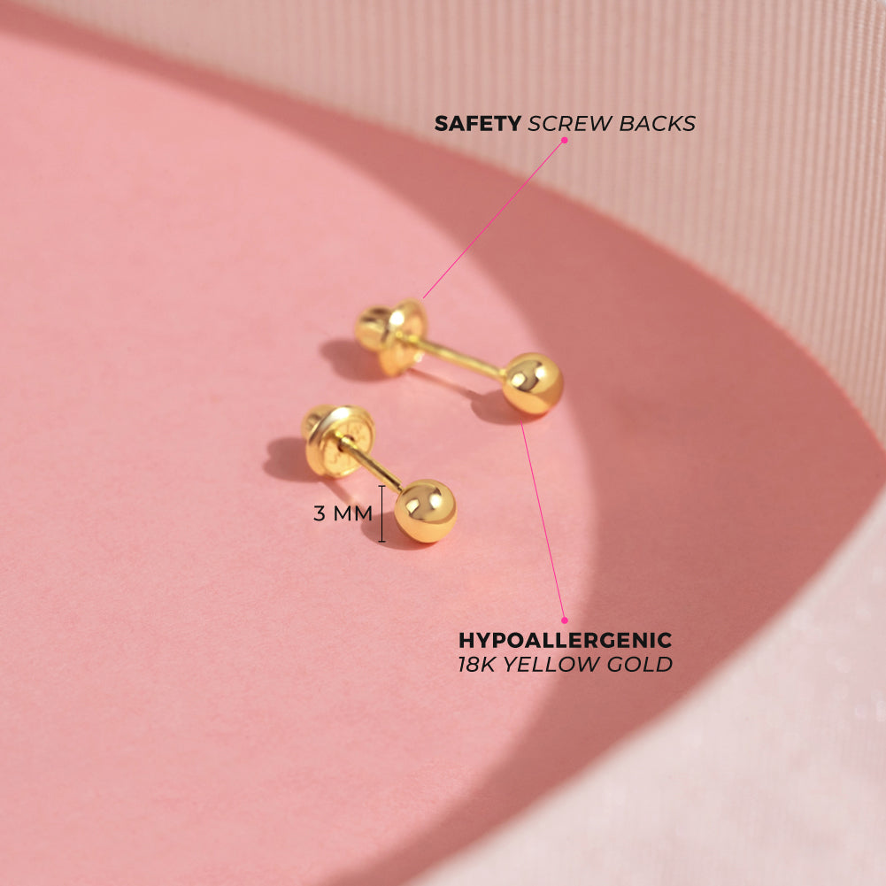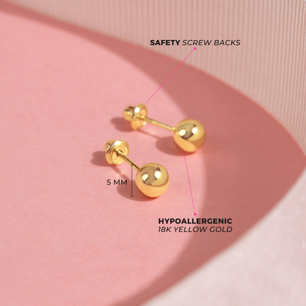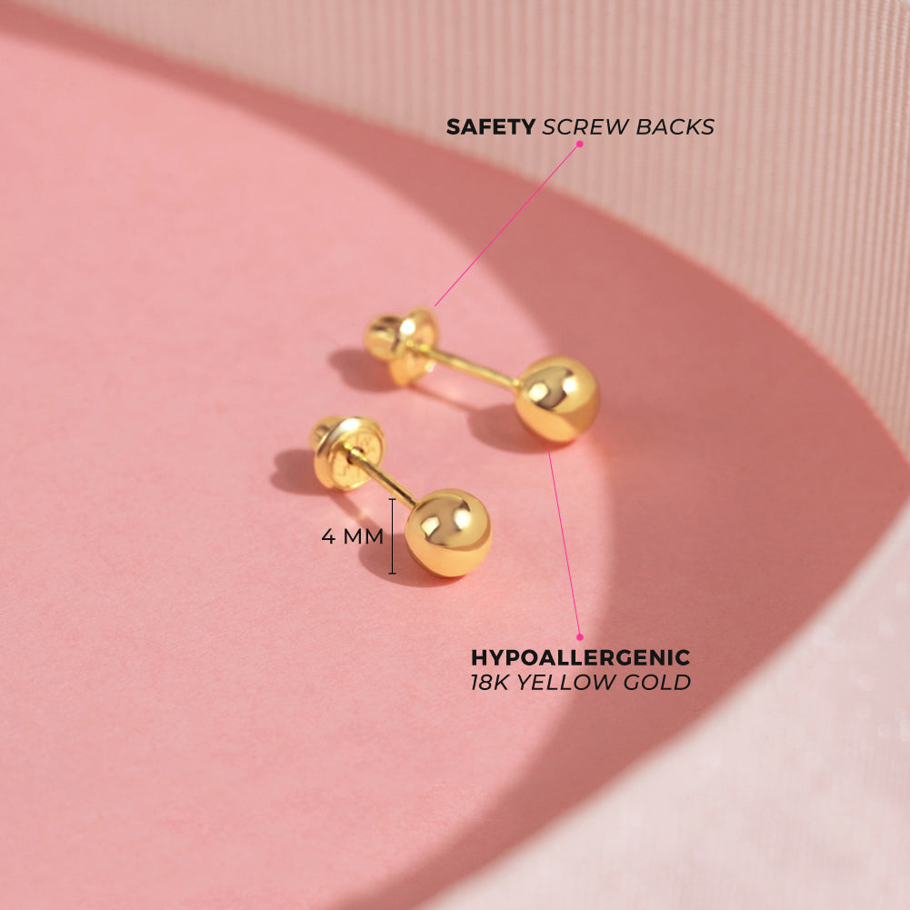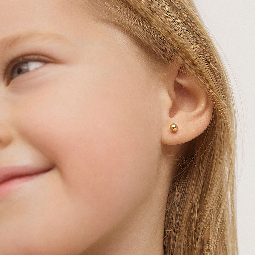 Classy, traditional, and classic, these 18k gold ball stud earrings for little girls are sure to impress! These 18k gold kids stud earrings are ideal for little girls of all ages from infant to pre-teen. Crafted in solid 18k gold for European standards, these elegant girl's ball earrings are completely safe for children with sensitive ears. These toddler stud earrings are available in 3mm, 4mm, and 5mm for varying ages of children. These quality 18k gold ball earrings feature a safety back system with threaded earring posts and backs to ensure your child's earrings stay comfortably and safely in place at all times. A complimentary gift box is included to help make gift-giving even more special!