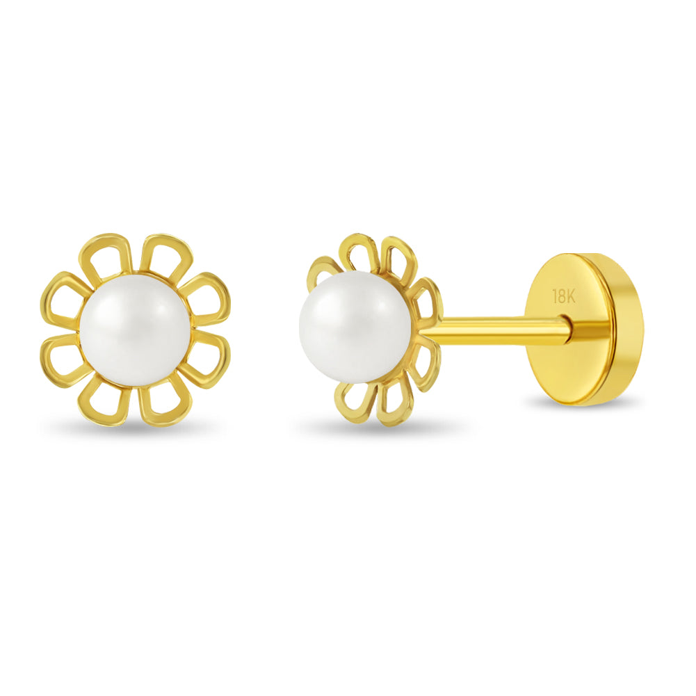 Gracefully crafted, these baby and toddler earrings feature a charming outline flower design with a freshwater cultured pearl nestled at the center. Made from 18k yellow gold, they are lovely for sensitive skin, ensuring both safety and comfort for little ears. The secure safety push back closure keeps the earrings securely in place, making them great for daily wear. Combining delicate floral elegance with timeless pearl beauty, these earrings are a sweet and stylish addition to any young girl’s jewelry collection. Gift box included with purchase.