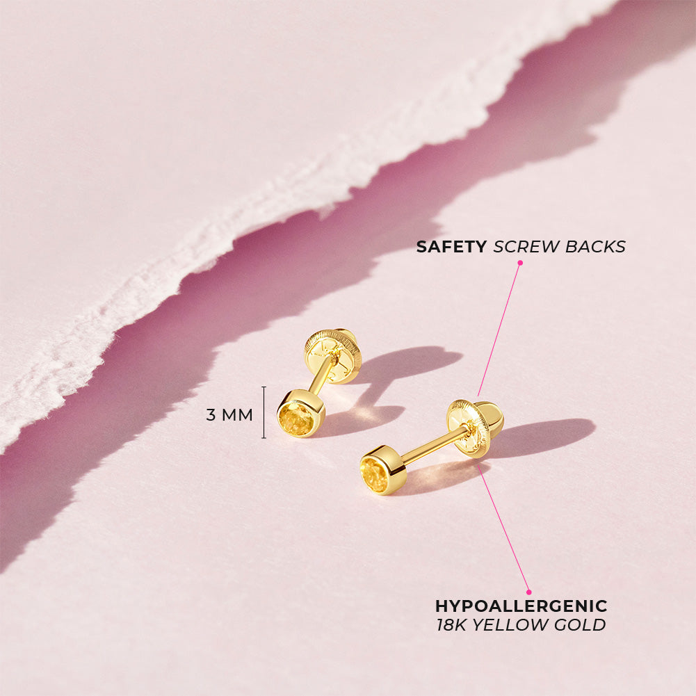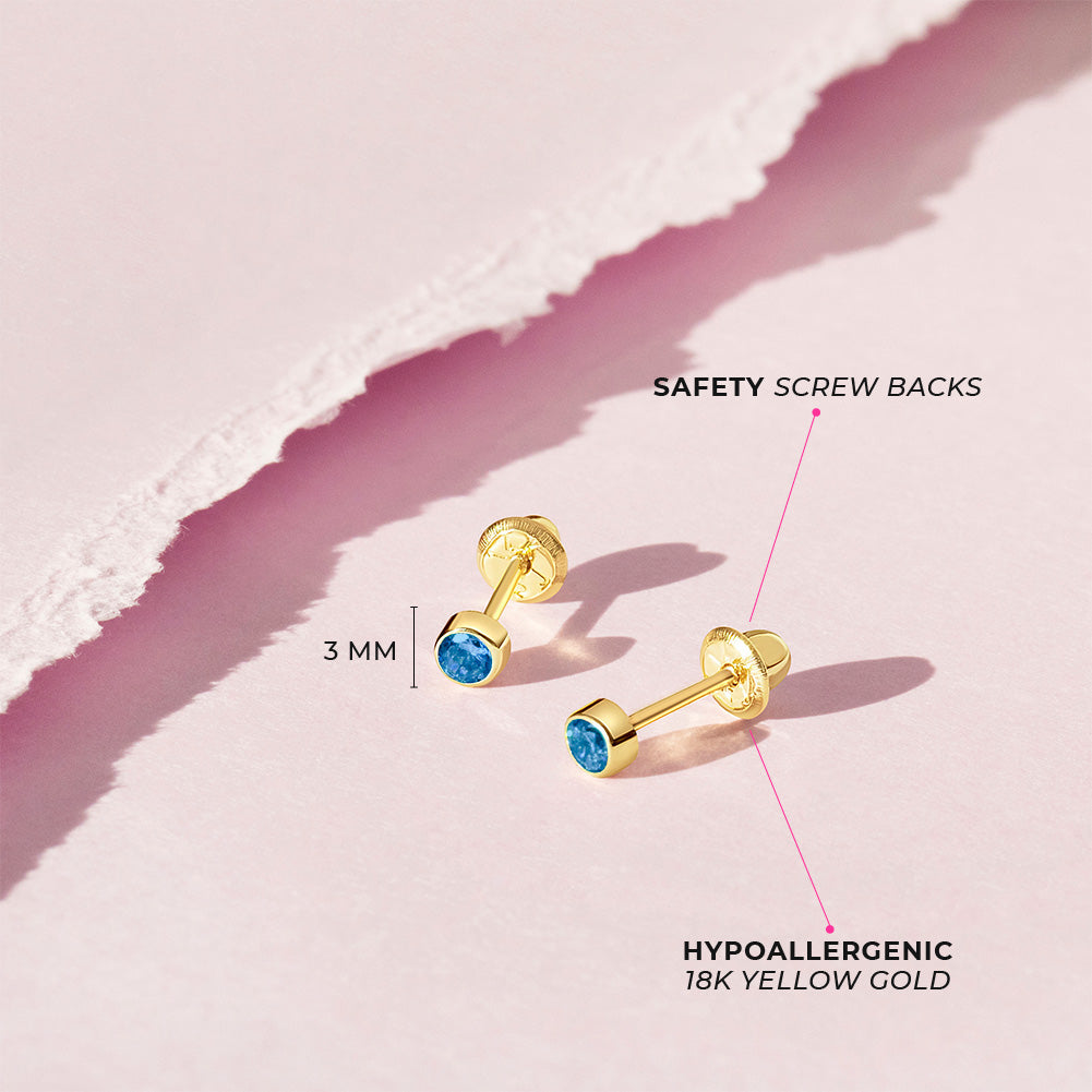 Classic, petite and sparkly, these 18k gold 3mm stud earrings for baby girls are perfect for daily use. Featuring a bright and flawless cubic zirconia stones as simulated birthstones in a bezel setting. Crafted entirely of 18k gold, these kid's earrings are suitable for sensitive ears, featuring the very precious material and craftsmanship. The threaded safety screw back design secures them to your child’s ears, making them conducive to the busy and active life of a toddler on the go. These 18k baby earrings make an easy gift choice for a girls birthday month, or if you want to choose their favorite color.