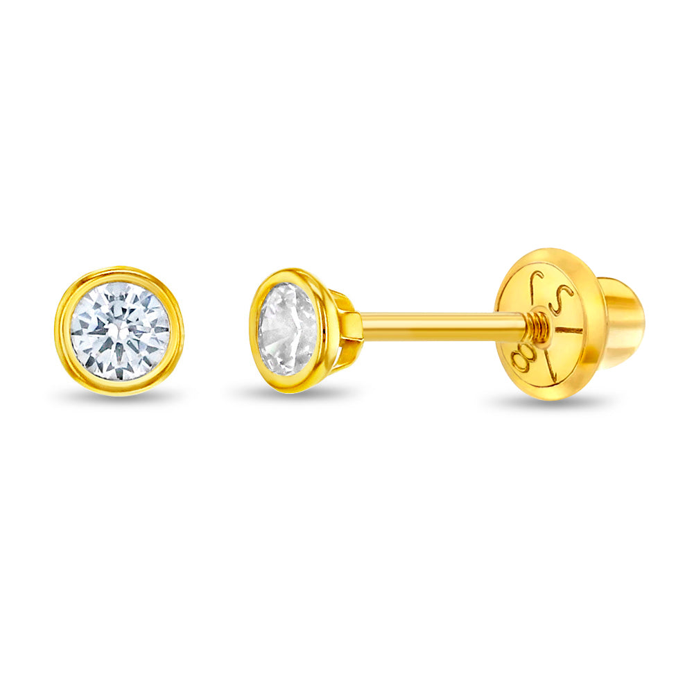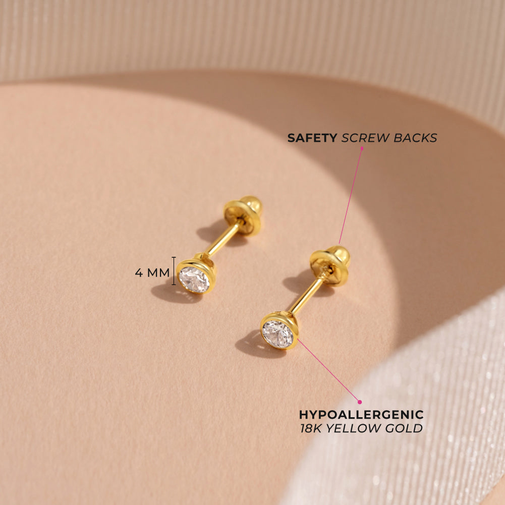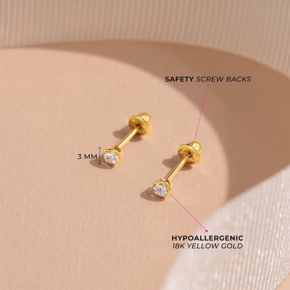 18k Gold Tiny Bezel Set CZ Baby / Toddler / Kids Earrings Safety Screw Back
