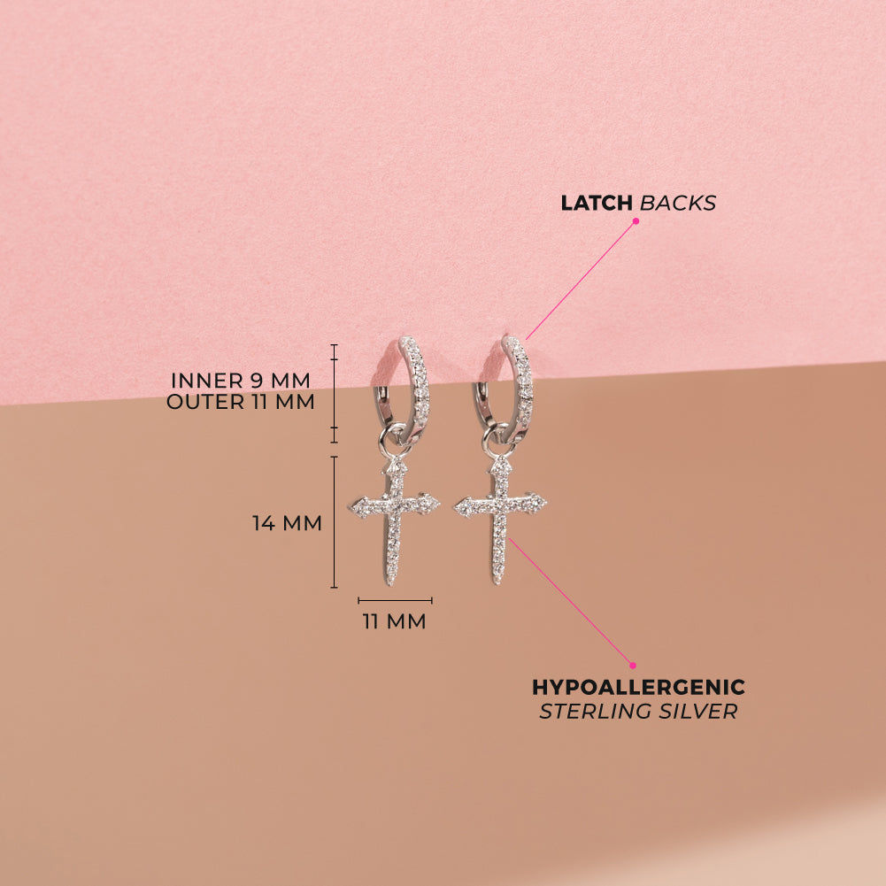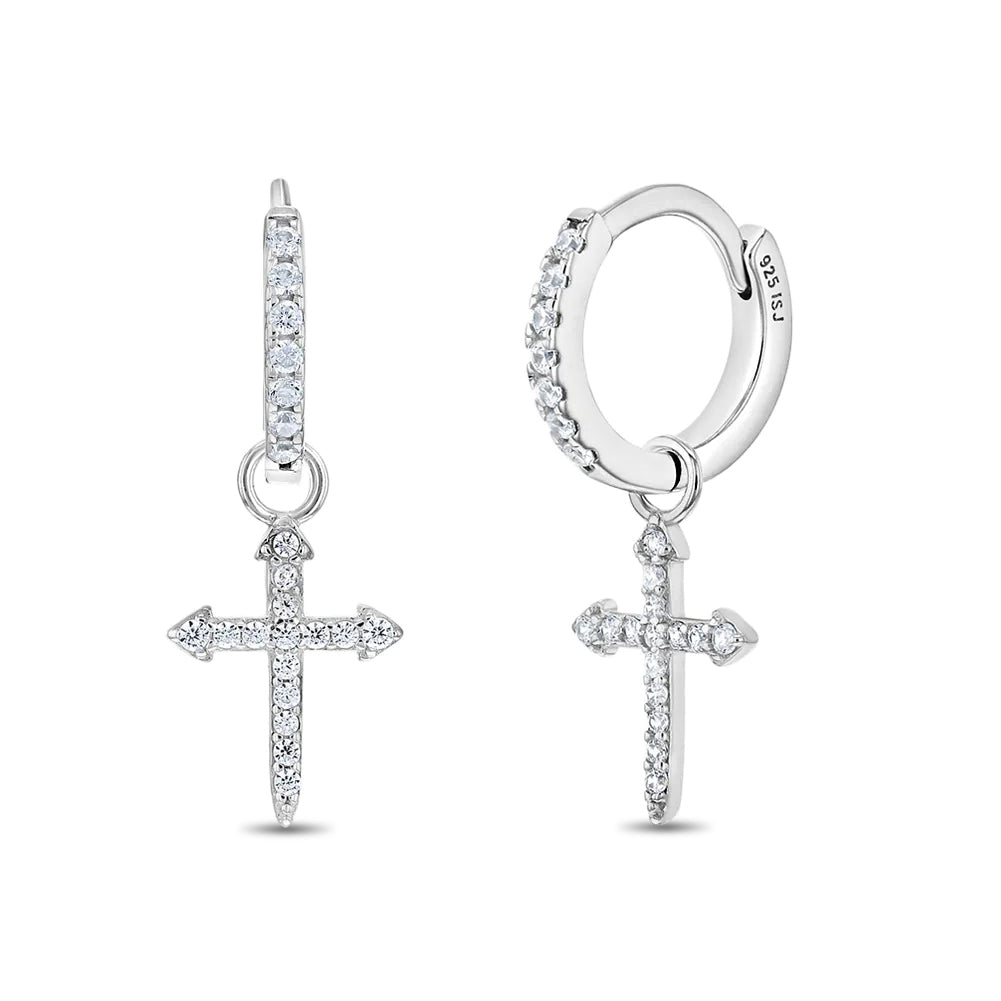 These beautiful sterling silver cross earrings are embellished with cubic zirconias for extra shine. These versatile earrings are eye-catching and yet not too bold, and the pair of earrings will complement both casual and formal outfits worn by women. The clear CZ earrings have a hoop and are easy to wear, and the earrings are also safe for sensitive ears. The religious earrings are packaged in a gift box and make the perfect present for young women and adult women who want to openly display their religion and their faith.