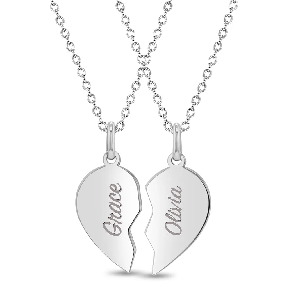 Uniquely designed for best friends, this pendant set for little girls and preteens is a symbol of everlasting friendship. Crafted from 925 sterling silver, each half piece of the heart showcases meticulous artistry. When brought together, they form a complete heart, representing the unbreakable bond between two kindred spirits. The hypoallergenic silver ensures comfort for sensitive skin. What adds an extra touch of personalization is the option to engrave each piece with their names, making it a treasured memento of their special connection. This pendant set embodies the power of friendship, reminding them that they are forever connected, heart to heart. Gift Box is included with purchase.
