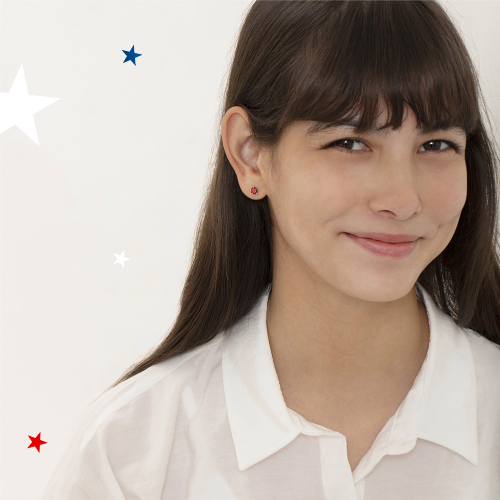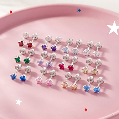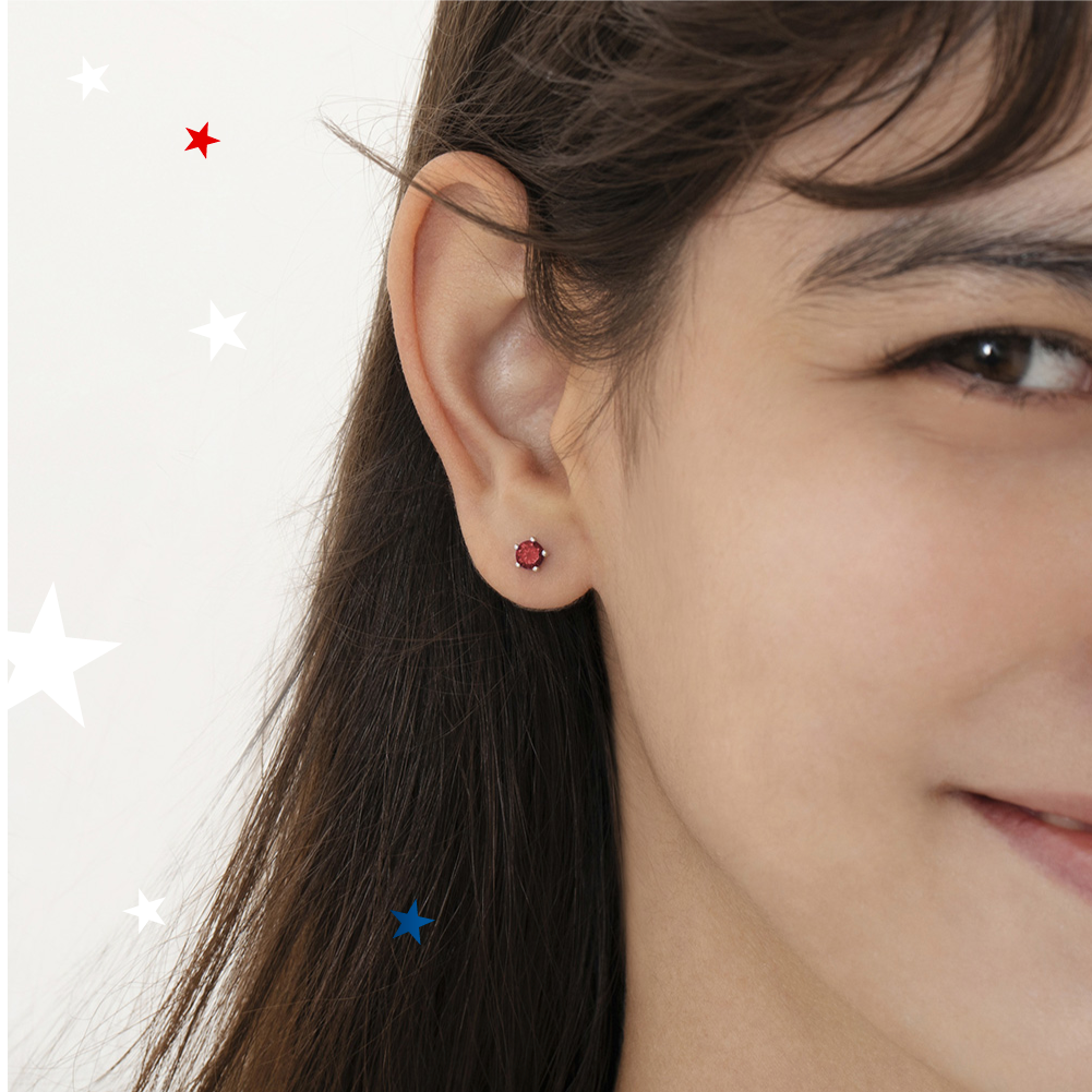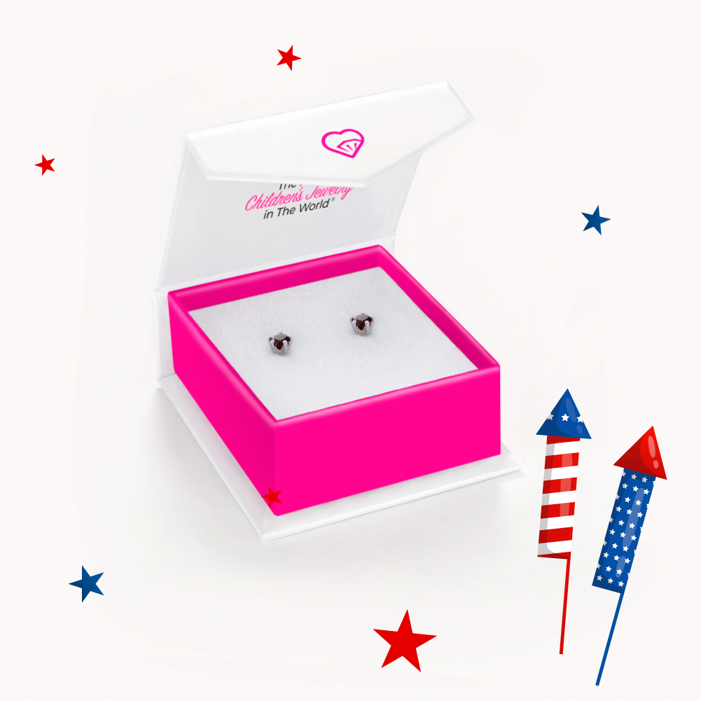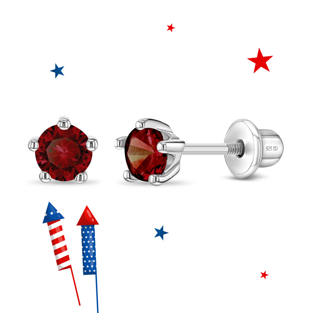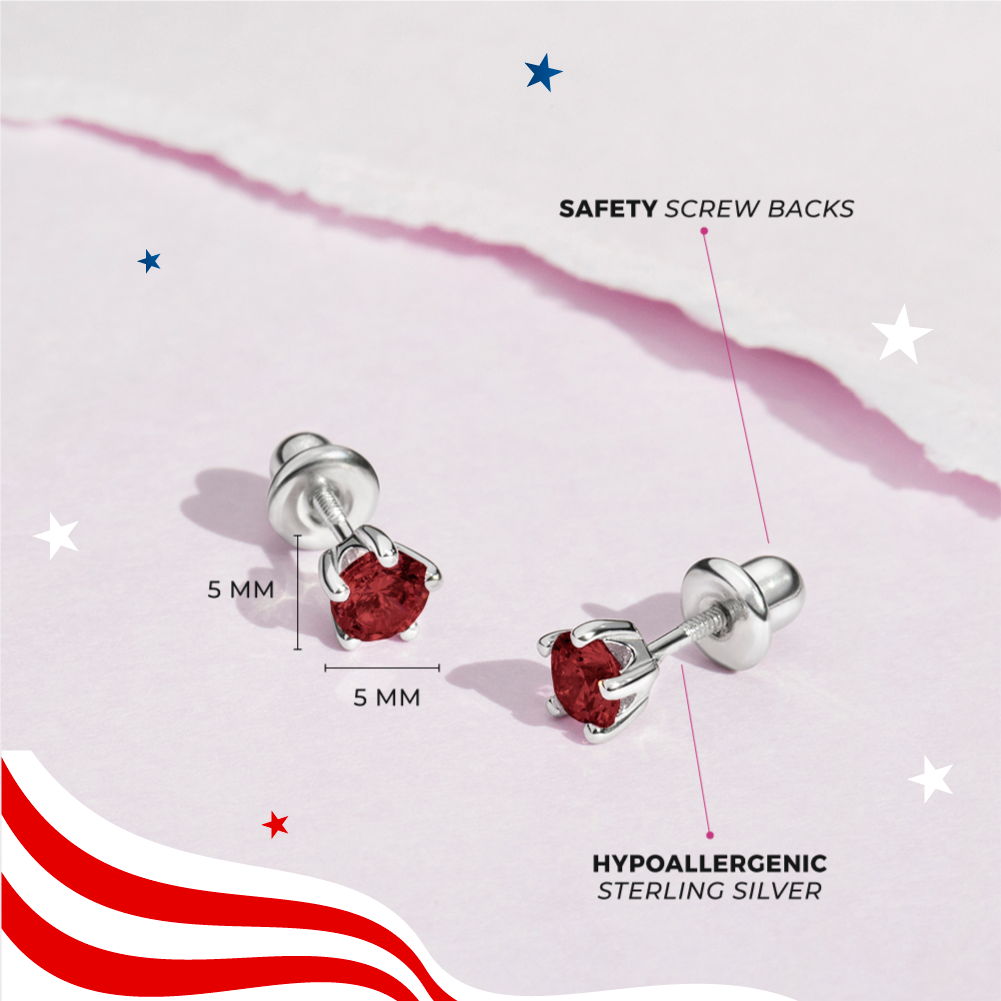 Set in a traditional jeweler's 5 prong setting, these simulated garnet birthstone earrings are elegant and timeless. The flawless 4mm red cubic zirconia stones are set entirely in 925 sterling silver, a naturally HYPOALLERGENIC fine metal. These earrings feature threaded posts and a safety back system to ensure your child's earrings stay comfortably in place. The perfect pair of earrings for toddlers born in the month of January. A complimentary gift box is included for easy giving!