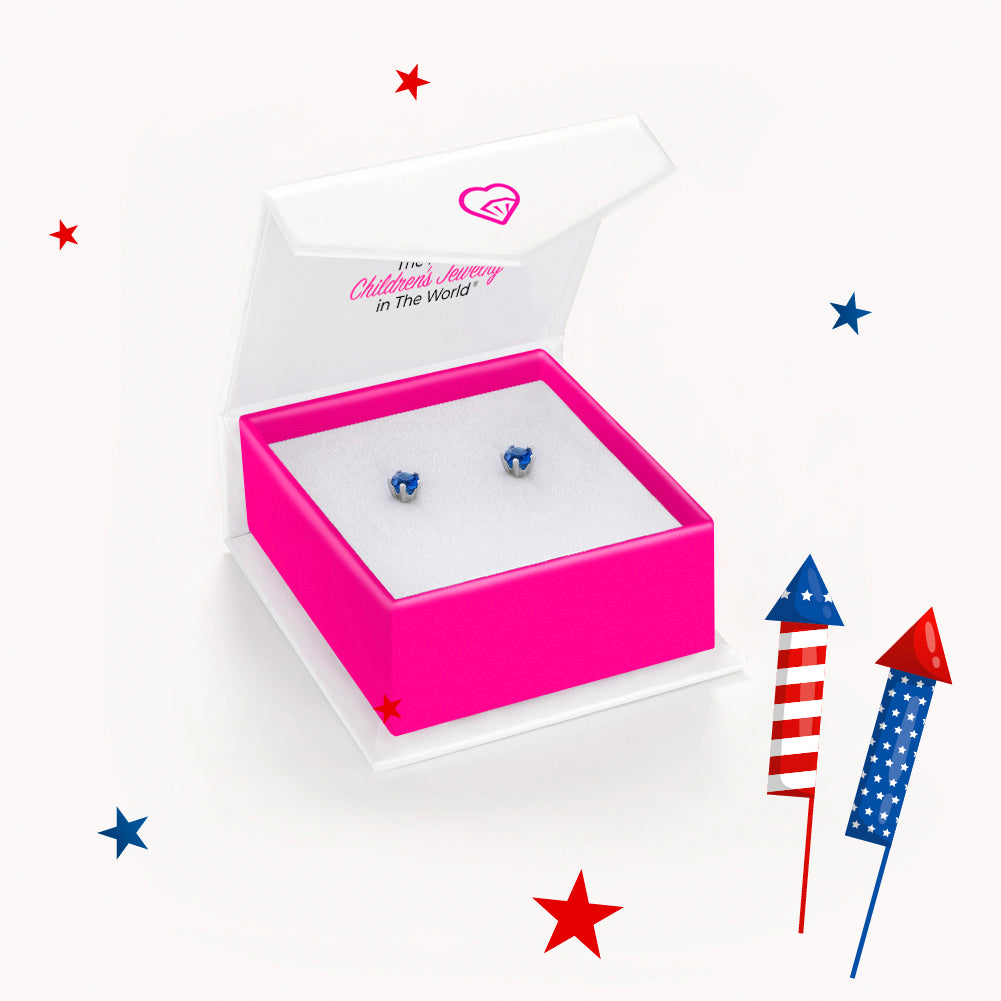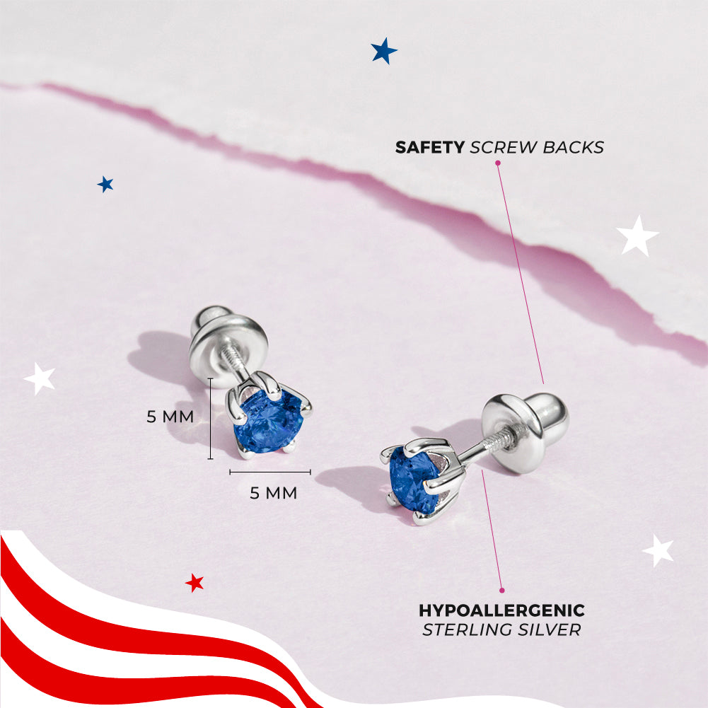 Set in a traditional jeweler's 5 prong setting, these simulated sapphire birthstone earrings are elegant and timeless. The flawless 4mm navy cubic zirconia stones are set entirely in 925 sterling silver, a naturally HYPOALLERGENIC fine metal. These earrings feature threaded posts and a safety back system to ensure your child's earrings stay comfortably in place. The perfect pair of earrings for toddlers born in the month of September. A complimentary gift box is included for easy giving!