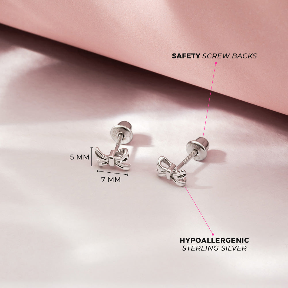 Nothing goes together like little girls and bows! Simple yet playful in design, these bow-shaped sterling silver earrings for young girls are perfect for any special occasion or for everyday play. These screw back young girl earrings stay in their place while your little one goes about her busy day. Sterling silver is hypoallergenic which means they are ideal for kids with sensitive ears. Gift box is included for easy gift giving.