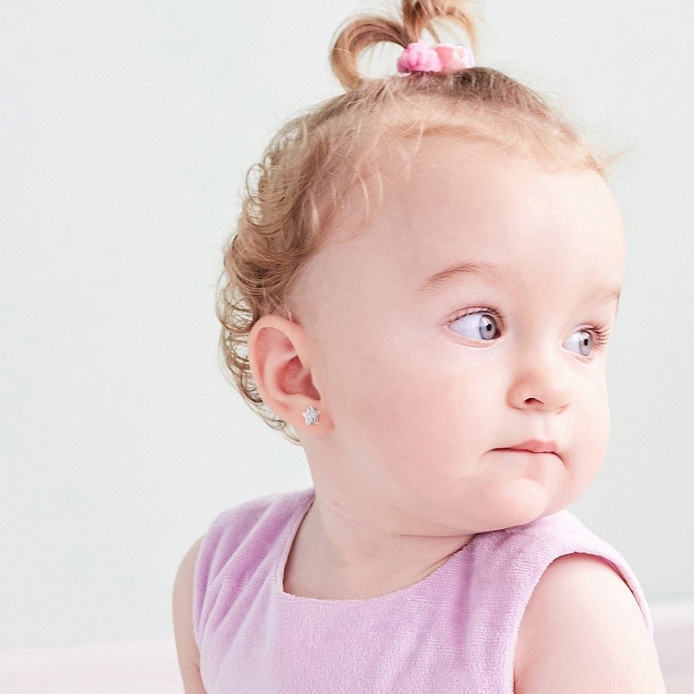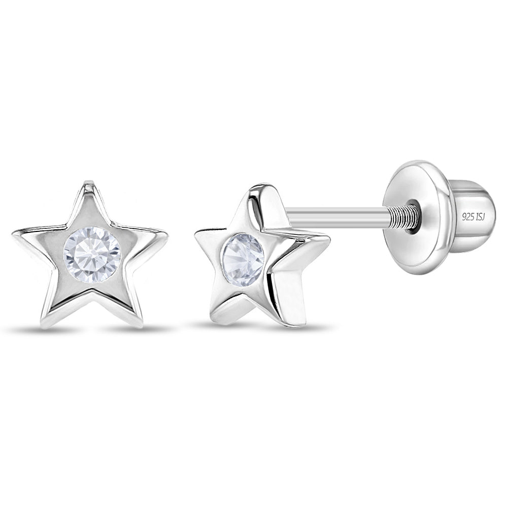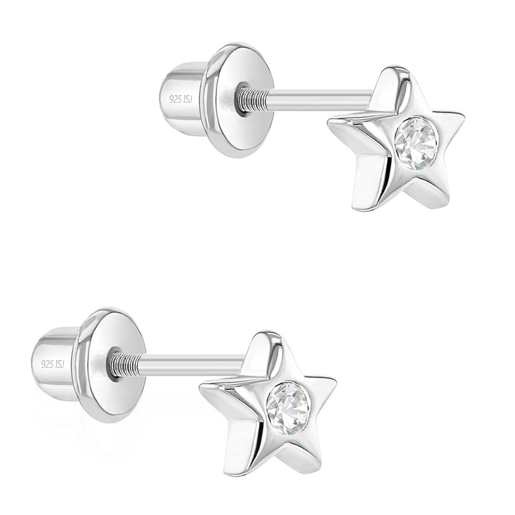 Add some twinkle to your little girl's ears with these beautiful star toddler earrings. Crafted entirely in 925 sterling silver and clear cubic zirconia stones, they are hypoallergenic and safe for children with sensitive ears.They feature a threaded earring post and back to ensure your child's earrings stay safely and comfortably in place. A complimentary gift box is included.