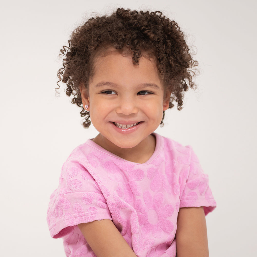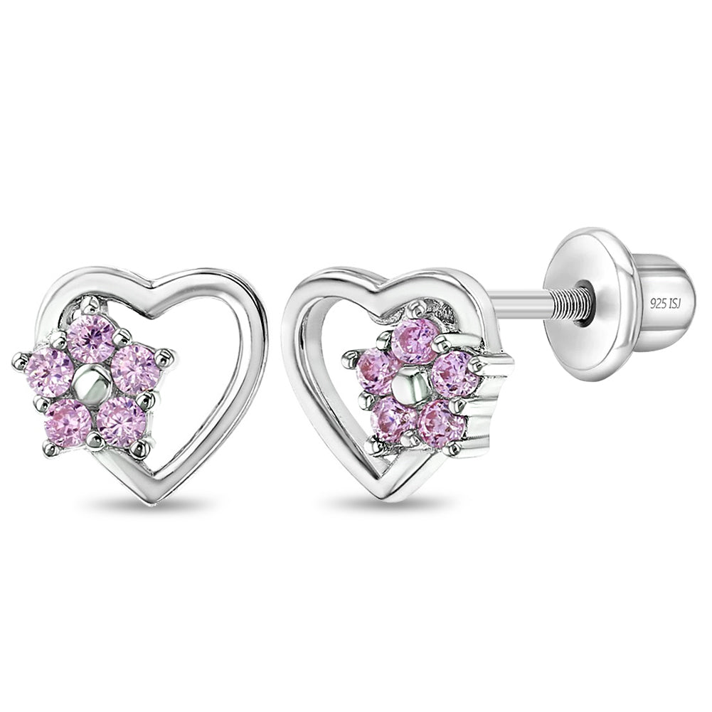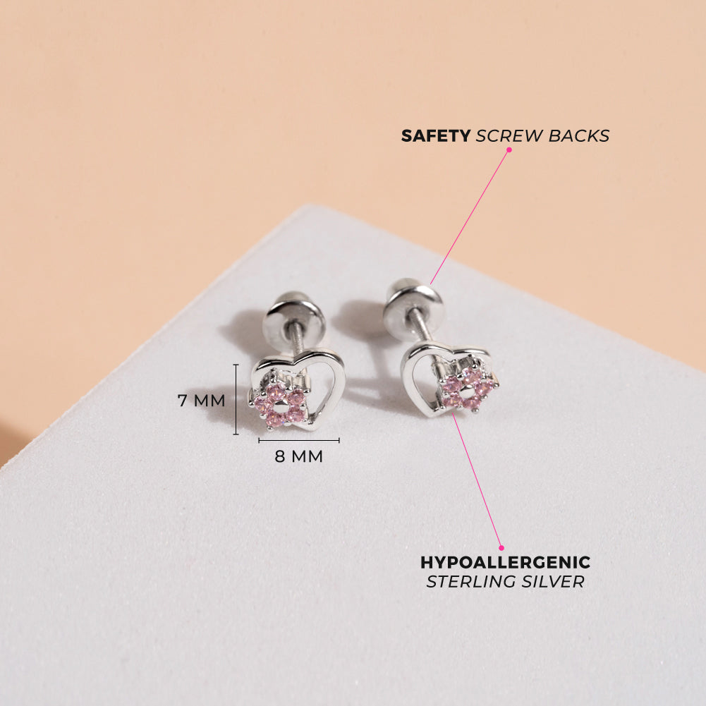 Fill your little girls heart with joy with this pair of small heart and flower stud earrings. This is an exclusive design, the silver heart is adorned with 5 pink cubic zirconias that form a gorgeous flower. Finely crafted entirely in 925 sterling silver and cubic zirconia stones, they are hypoallergenic and safe for children with sensitive ears.They feature a threaded earring post and back to ensure your child's earrings stay safely and comfortably in place. A complimentary gift box is included.