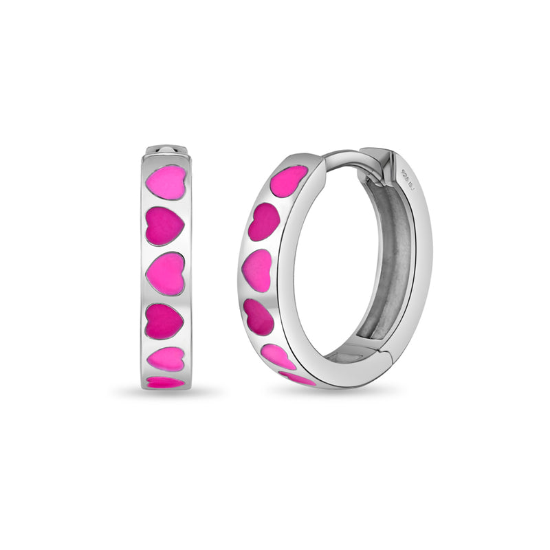 Add some color to your little girl's jewelry collection with these adorable huggie hoop earrings. Crafted from hypoallergenic 925 sterling silver, they are sweet for girls with sensitive skin. Each hoop is beautifully stamped with delicate pink enamel hearts, adding a charming detail. Designed for a secure and comfortable fit, these Huggie Hoops are easy to wear and fun for everyday style or special occasions. A lovely gift for any young fashionista! gift box included with purchase.