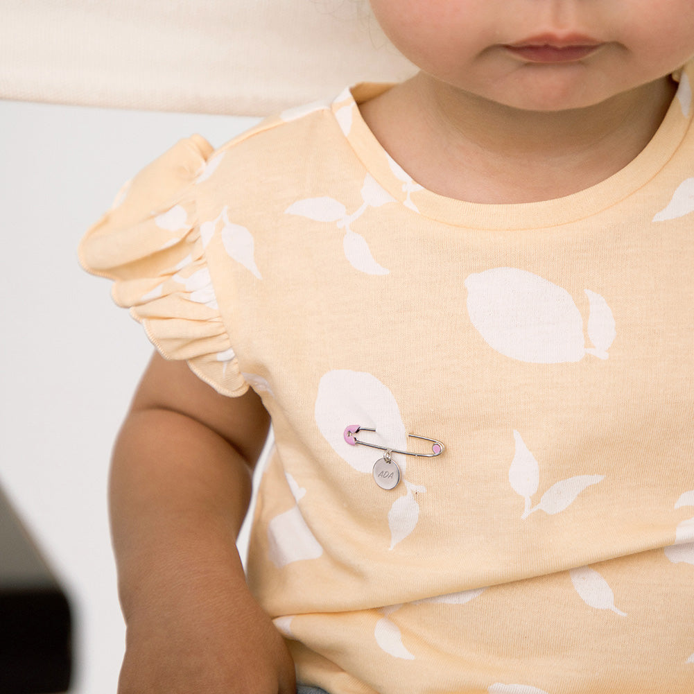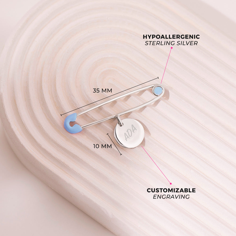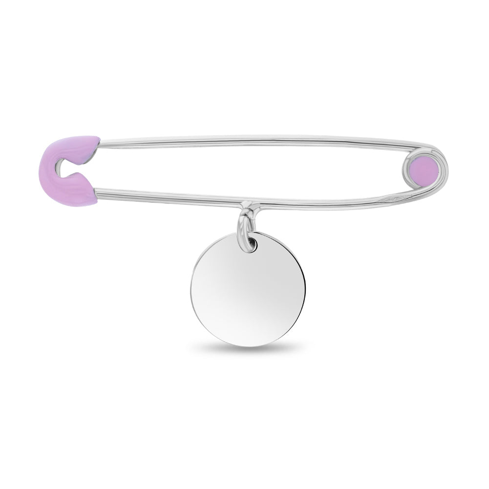 Announce the arrival of your newborn baby with this sweet baby safety pin brooch. A safety pin brooch entirely crafted from 925 sterling silver, that features a tiny round charm that can easily be engraved with the date of birth of the baby or their initials. Add this adorable safety pin brooch onto your little ones going out outfits. A brooch that can be easily placed onto your little ones going home outfits or blankets. A gift box is included with purchase.
