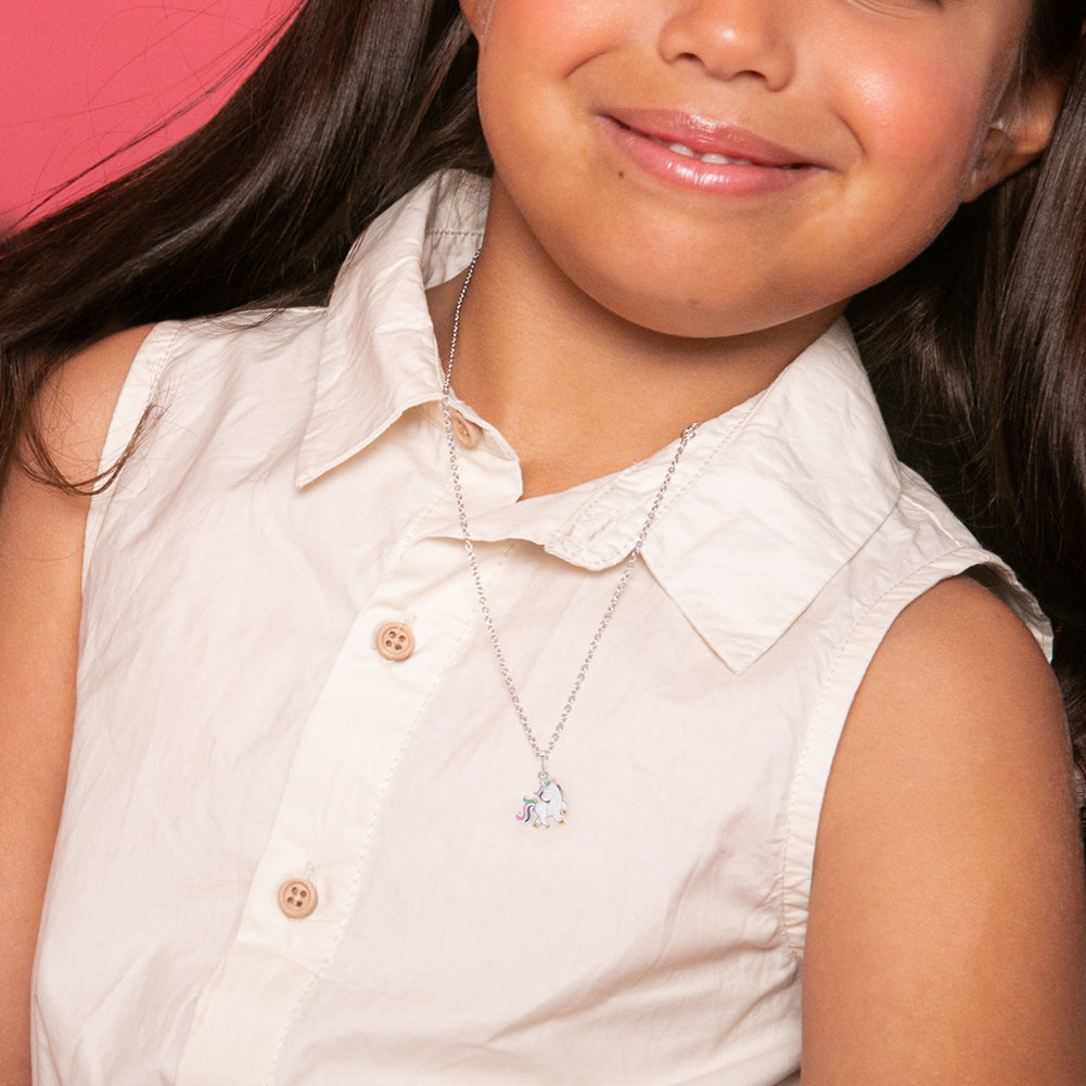 Let your little girls imagination run free with this beautiful magical galloping unicorn jewelry set. A stunning enamel set that features a fun and bright enamel unicorn pendant with matching push back earrings. She will adore all of the colors beautifully detailed throughout this set. This sweet unicorn set arrives packaged in a gift box for easy gifting.