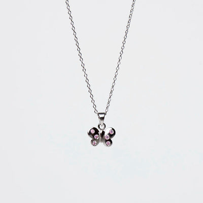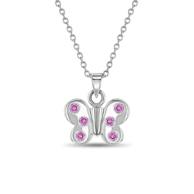 Surprise your favorite girl with this beautiful sterling silver butterfly necklace. This nature inspired piece features pink cubic zirconia butterfly pendant dangling from a matching sterling silver chain with a spring ring clasp. You can also let your little girl know that butterflies represent change, hope and life and it will quickly become one of her favorite pieces. Since it's crafted with 925 sterling silver, with proper care it will not lose shine for many years to come. Item will arrive neatly packaged in its own little gift box for your convenience.