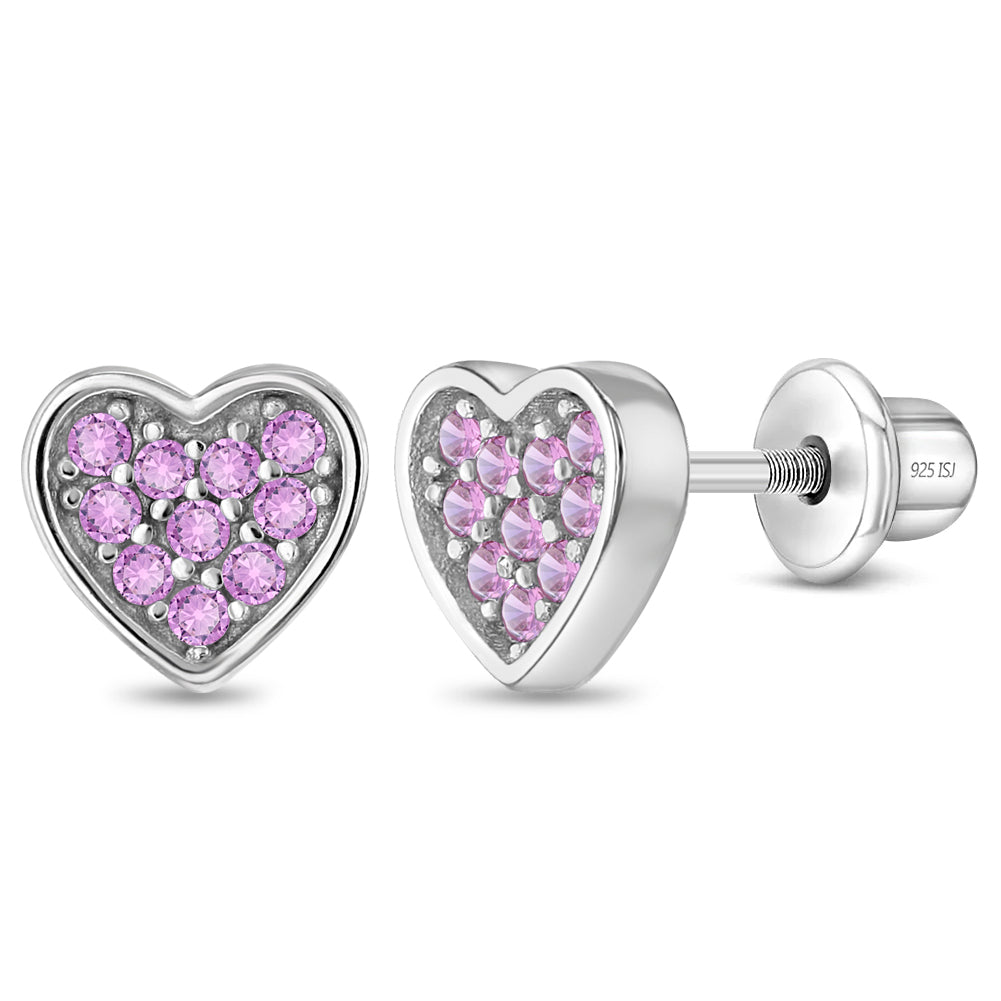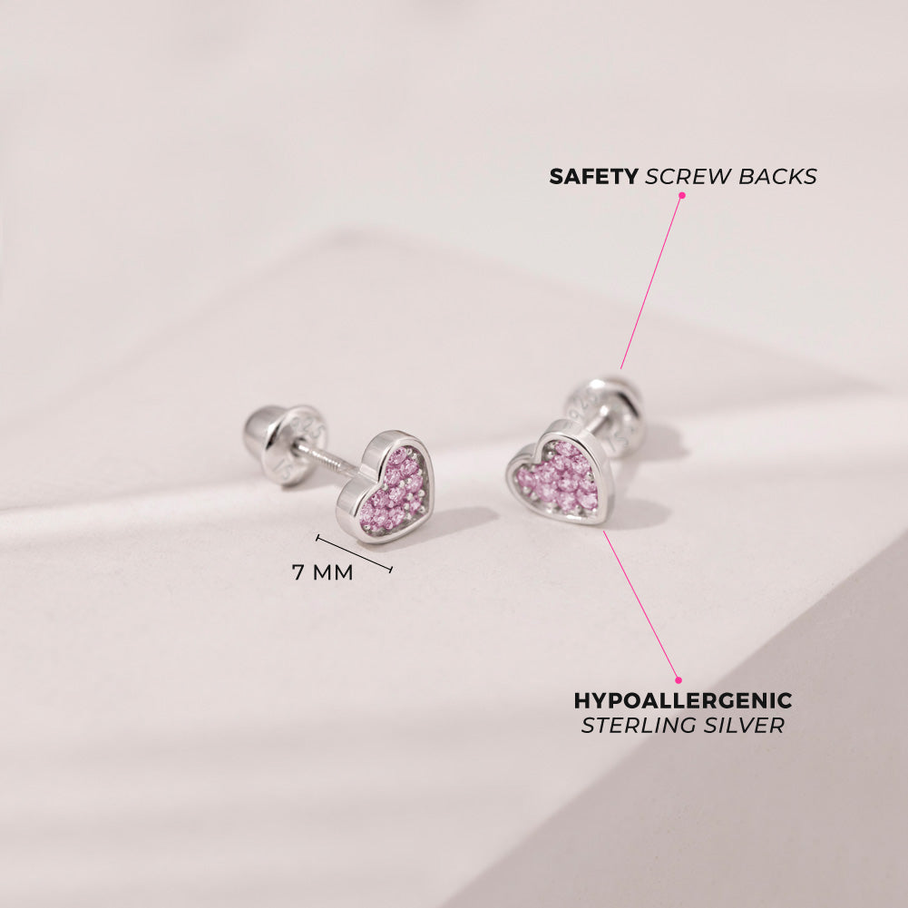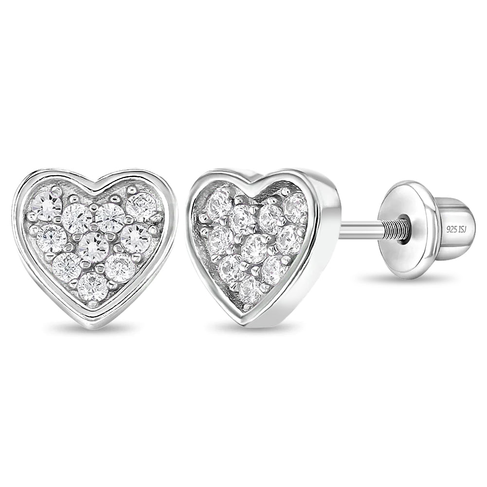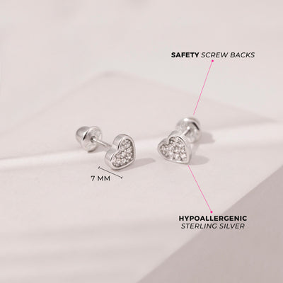 Perfect sparkly accessory to any outfit! This pair of heart earrings are sure to become your little girl's favorite. Crafted entirely in 925 sterling silver and cubic zirconia stones, they are hypoallergenic and safe for children with sensitive ears. They feature a threaded earring post and back to ensure your child's earrings stay safely and comfortably in place. A complimentary gift box is included.