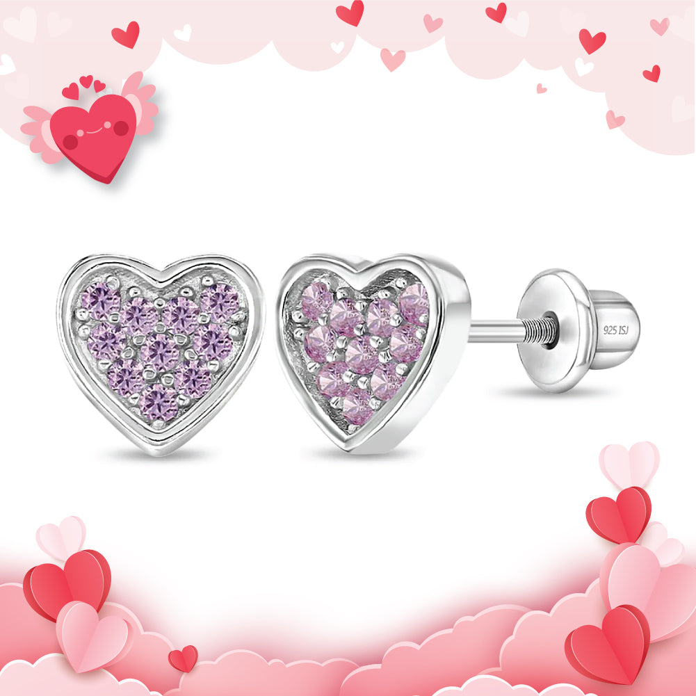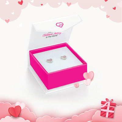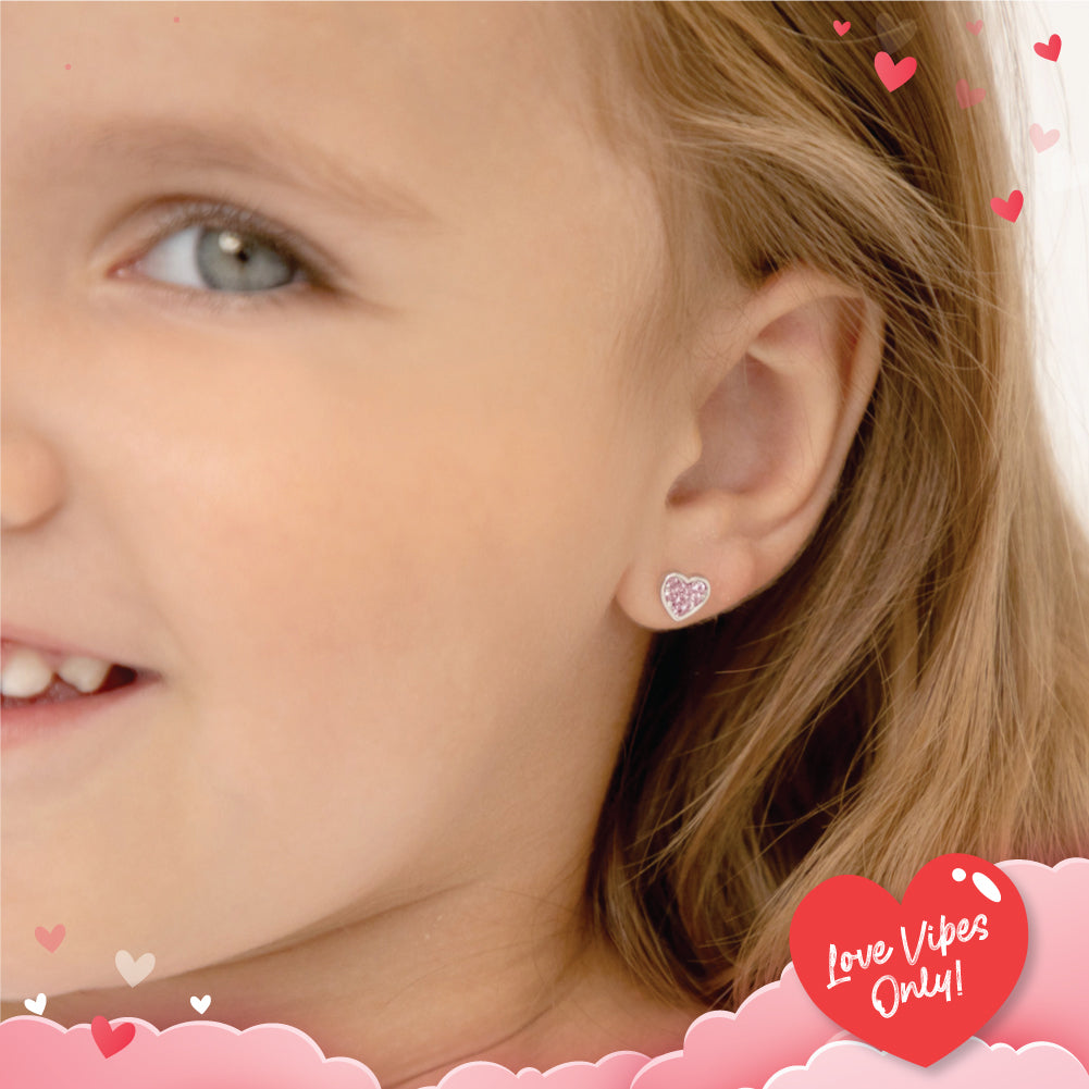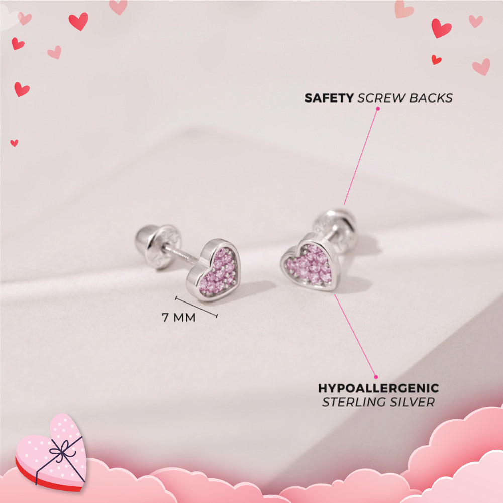 Perfect sparkly accessory to any outfit! This pair of heart earrings is sure to become your little girl's favorite. Crafted entirely in 925 sterling silver and cubic zirconia stones, they are hypoallergenic and safe for children with sensitive ears.They feature a threaded earring post and back to ensure your child's earrings stay safely and comfortably in place. A complimentary gift box is included.