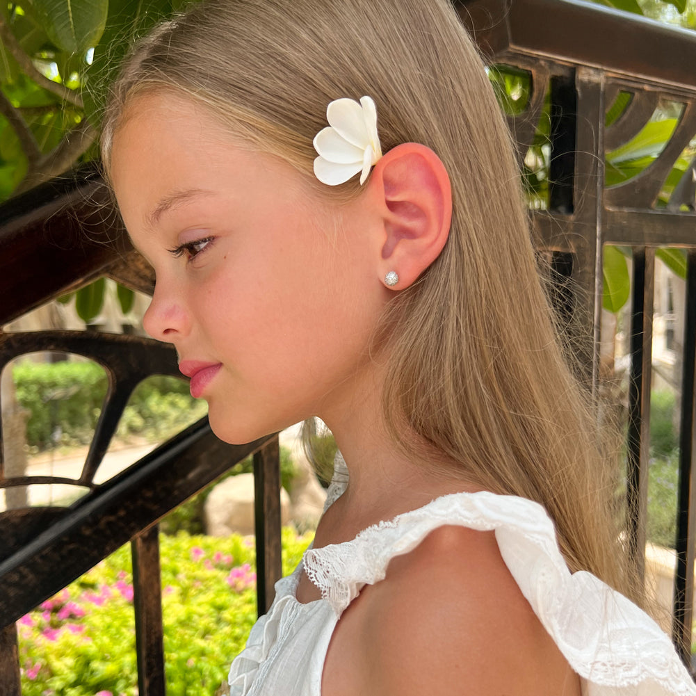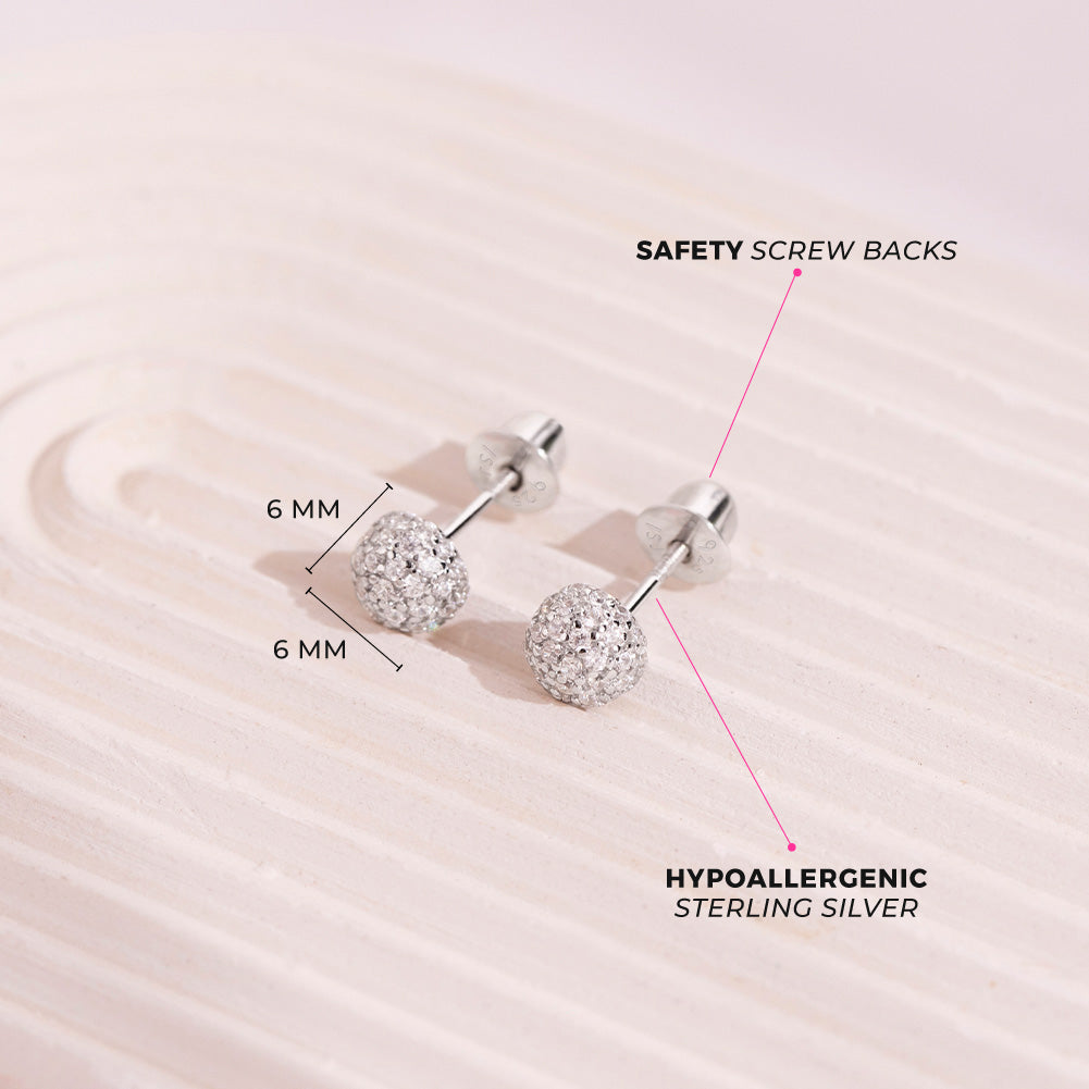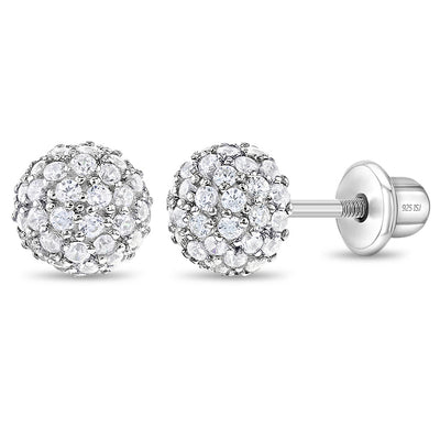 Charm the young lady in your life with this pair of sterling silver cubic zirconia earrings. These earrings are bursting full of tiny cubic zirconia's that are sure to enchant her with their sparkle and shine. Finely crafted entirely in 925 sterling silver and cubic zirconia stones, they are hypoallergenic and safe for children with sensitive ears.They feature a threaded earring post and back to ensure your child's earrings stay safely and comfortably in place. A complimentary gift box is included.