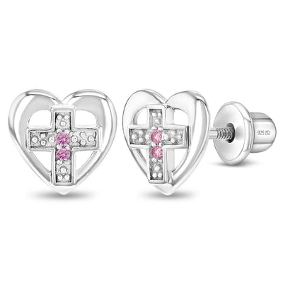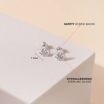 A timeless design infused with charm, our dainty pink CZ 925 sterling silver heart cross safety screw back earrings are great for little girls. Meticulously crafted in 925 sterling silver, these earrings are not only beautifully subtle but also incredibly comfortable for your precious child. An lovely choice for religious jewelry, this piece is bound to capture her affection swiftly. Plus, it comes in a delightful gift box—ideal for little girls with sensitive ears.