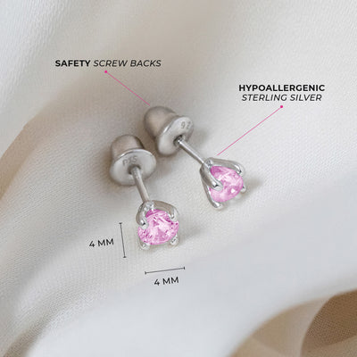 Classic prong set solitaire cubic zirconia stud little girl's earrings. Using a modern jeweler's prong setting, this piece is designed to bring attention to the beautiful cubic zirconia solitaire stone. These earrings are the perfect size for toddlers and little girls and feature a child-safe, safety screw back system to ensure a secure and comfortable fit for your little one. They are entirely crafted in 925 sterling silver, a naturally hypoallergenic fine metal that is safe for children with sensitive ears. These are the perfect gift for a special little girl in your life. A complimentary gift box is included to make gift-giving fun and easy!