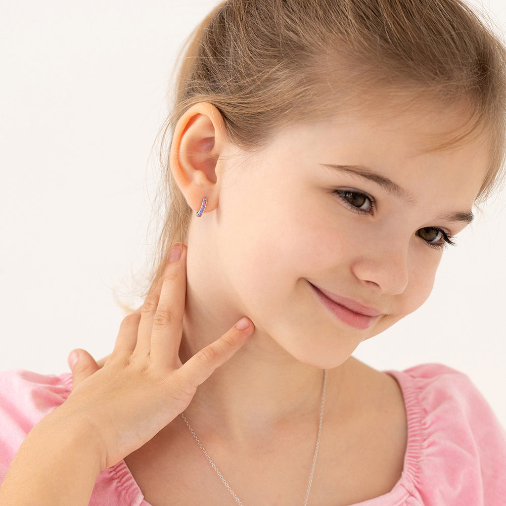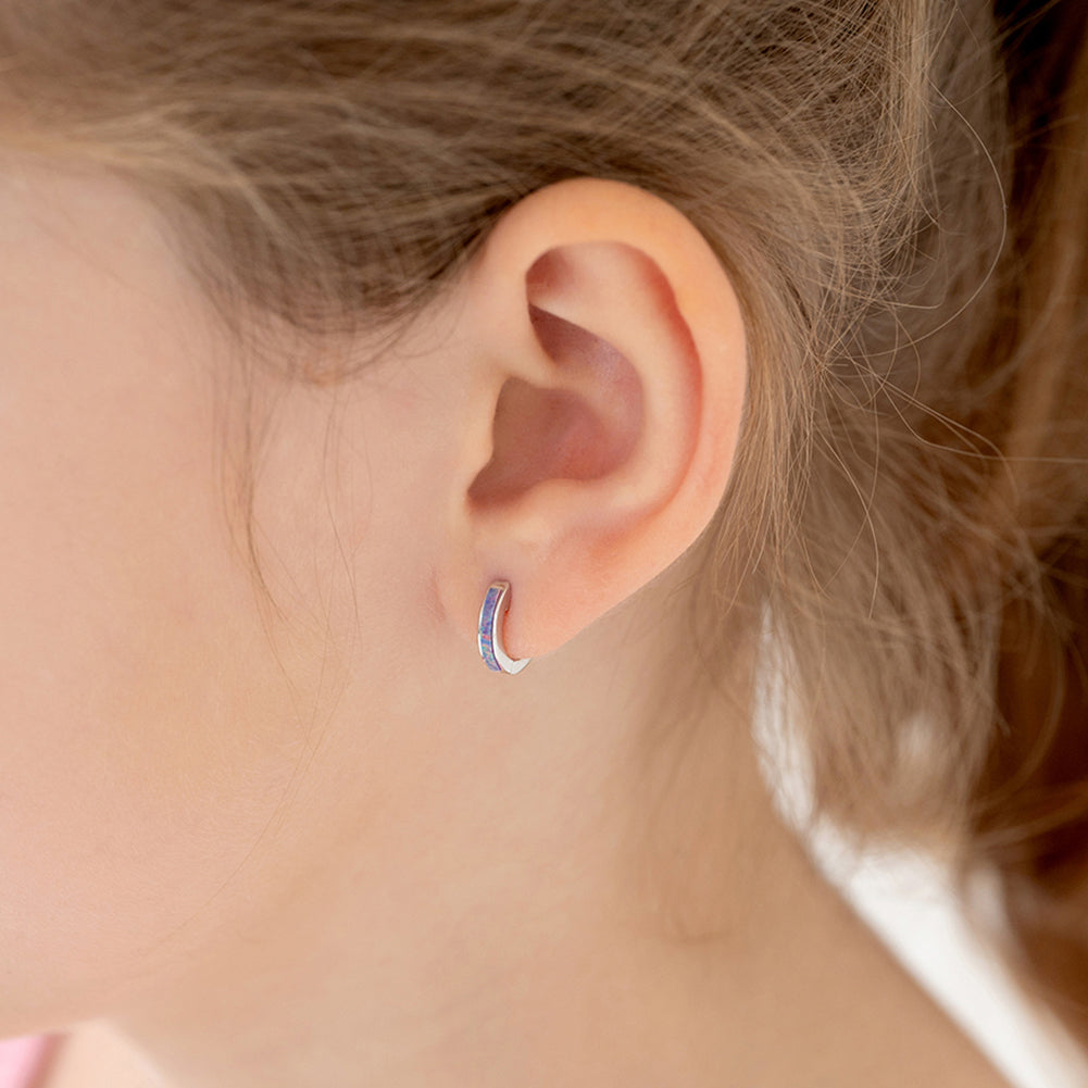 Your little girl will adore the sweet colors that reflect off of these small simulated opal huggie hoop earrings. These adorable huggie hoop earrings for young girls is crafted with a fun simulated opal inlay beautifully displayed in the front. Made delicately from hypoallergenic 925 sterling silver, these earrings are safe for young girls who have sensitive ears. Created with a hinged closure, it will remain safely on their ears. A lovely present for a young girl to make a statement. A gift box is included with purchase.