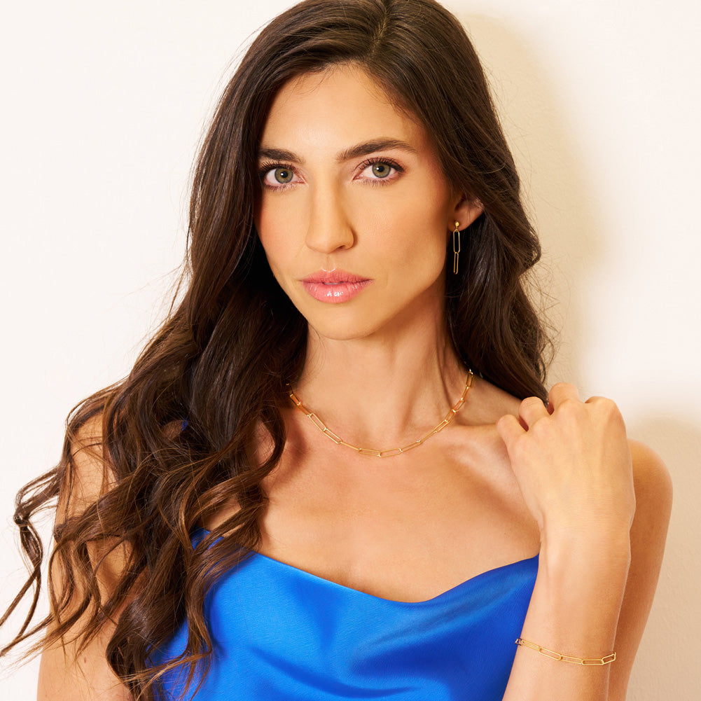 This elegant paperclip necklace, is a versatile addition to elevate your jewelry collection. Crafted from hypoallergenic 14k yellow gold flashed 925 sterling silver, this necklace offers both style and comfort, great for everyday wear. Measuring 16 inches with an extra 1.5-inch extension, it provides a customizable fit for any woman. The chic paperclip design exudes modern sophistication, effortlessly enhancing any ensemble with its understated elegance. Whether worn alone as a statement piece or stacked with other favorites, this necklace adds a touch of timeless charm to every occasion. Treat yourself or someone special to this versatile accessory that seamlessly transitions from day to night. Gift box included with purchase.