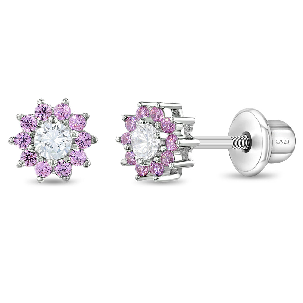 Little girls are adorable and we like to remind them of that by showering them with lovely things such as flowers. The pink cubic zirconia stones surround a clear CZ center flower. This stud earring set makes the perfect gift for your little princess. Crafted entirely in 925 sterling silver and cubic zirconia stone, they are hypoallergenic and safe for children with sensitive ears. They feature a threaded earring post and back to ensure your child's earrings stay safely and comfortably in place. A complimentary gift box is included .