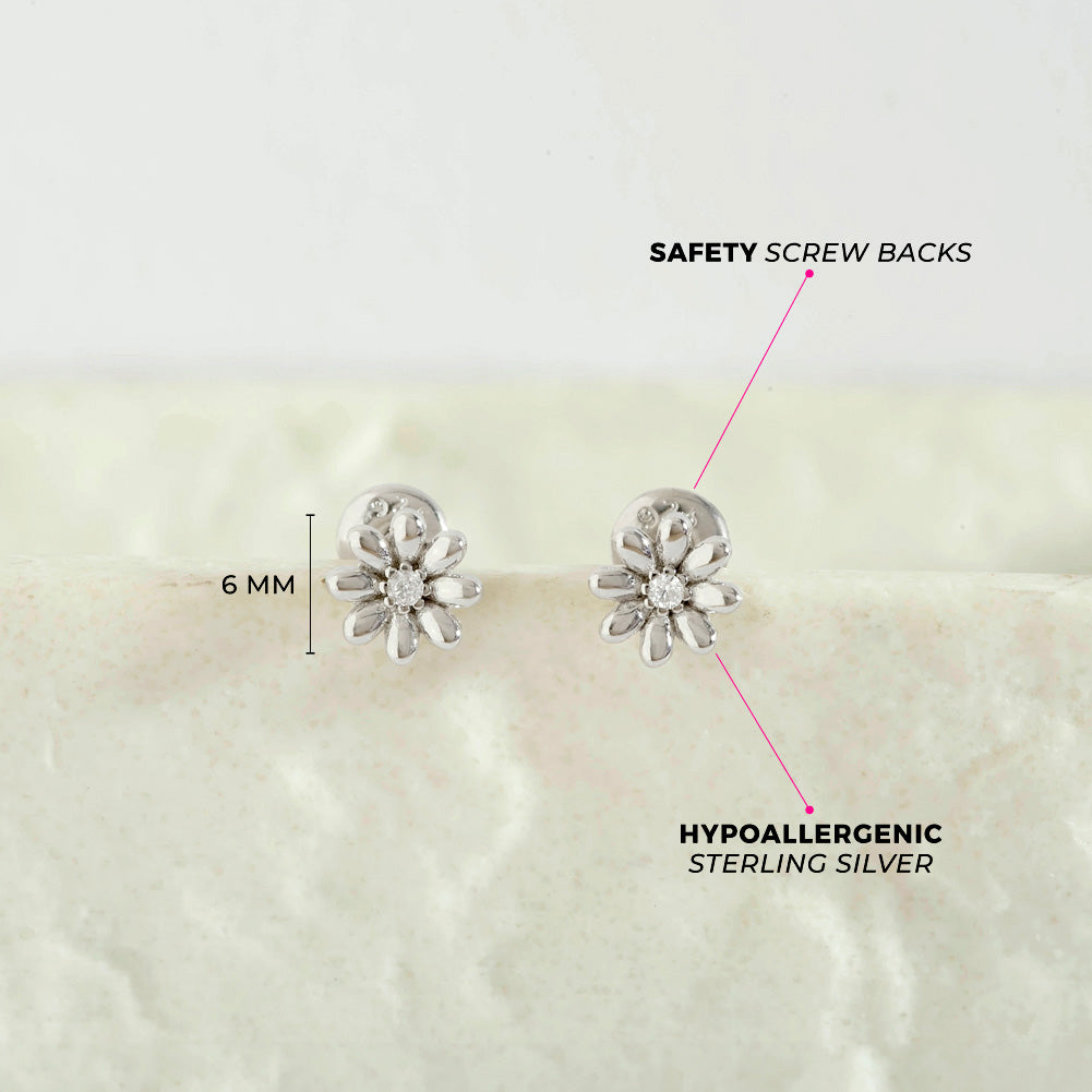 These adorable flower earrings are fun for little girls, crafted from 925 sterling silver, a hypoallergenic material ideal for sensitive skin. Designed with comfort and safety in mind, these earrings feature a delicate flower shape with a sparkling cubic zirconia stone at the center, adding a touch of elegance to any outfit. Lightweight and gentle on the ears, they make a beautiful and safe choice for your child’s everyday wear or special occasions. Gift box included.