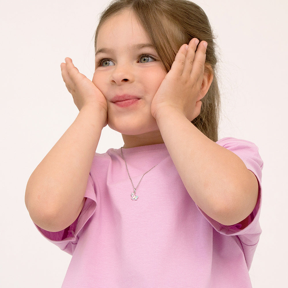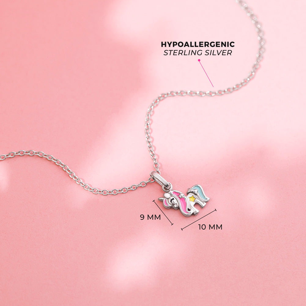 Looking for a beautiful unicorn gift for you little girl? This unicorn pendant necklace features a beautiful pink mane and aqua blue tail while a bright yellow star decorates the center of the unicorn. Made from a hypoallergenic 925 sterling silver and safe for young girls with sensitive skin. Matching chain is included. Order a sweet unicorn pendant necklace today and we'll package this into their own little gift box.