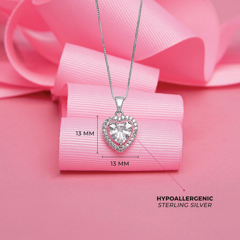 Sweet and delicate, we are in love with this brilliant cubic zirconia heart pendant necklace for girls. Made from 925 sterling silver, this dainty heart shape cubic zirconia centerpiece pendant shines bright with tiny round cz's around it. Your little girl will love and enjoy its shine everyday. This heart pendant comes with a complimentary 16 inches sterling silver chain. Perfect as Valentines Day gift or as a Birthday Gift for her. Gift box included.