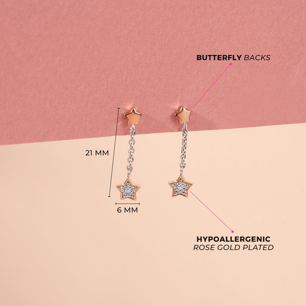 Shooting Stars CZ Chain Dangle Kids / Teen Earrings - Sterling Silver Rose Gold Plated