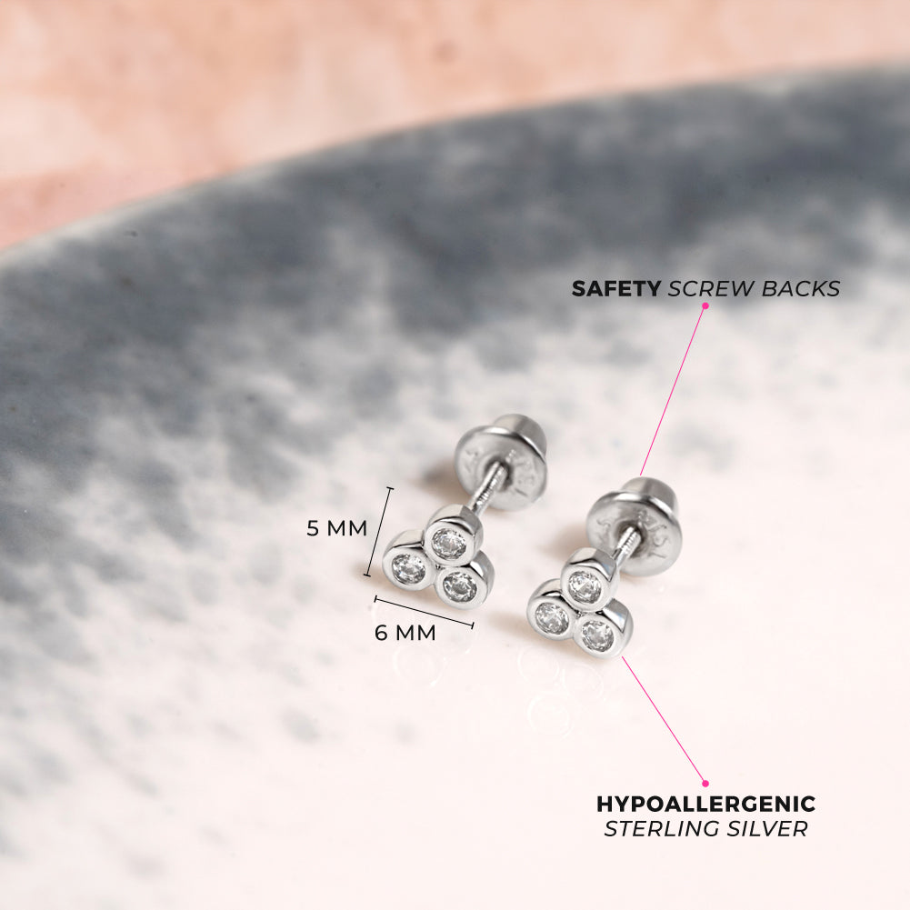 A dazzling pair of clear cubic zirconia stone earrings for a classic young girl. These children's cubic zirconia earrings feature tiny trio clusters of bezel-set clear cubic zirconia stones arranged in a delicate triangle shape. Crafted from hypoallergenic 925 sterling silver, these earrings are created for girls with sensitive skin. The safety screw back closure ensures secure and comfortable wear, providing an added layer of safety. A small gift box is included with purchase.