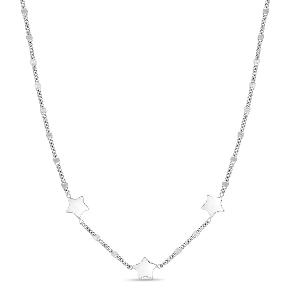 This delicate multi-star charm satellite chain necklace is a fun piece crafted for little girls and teenage girls. Made from 925 sterling silver, a hypoallergenic material, it offers both beauty and comfort. Measuring 16" with a 1-inch extension, it ensures a great fit. The intricate design showcases multiple stars, adding a touch of celestial elegance. This necklace is a timeless accessory, radiating charm and grace for those who wear it. Gift box included.