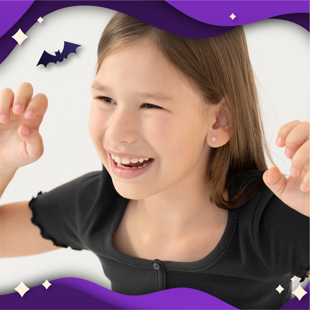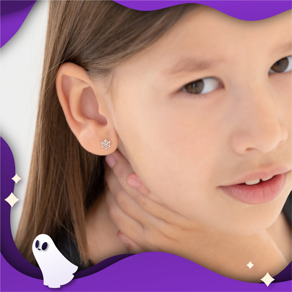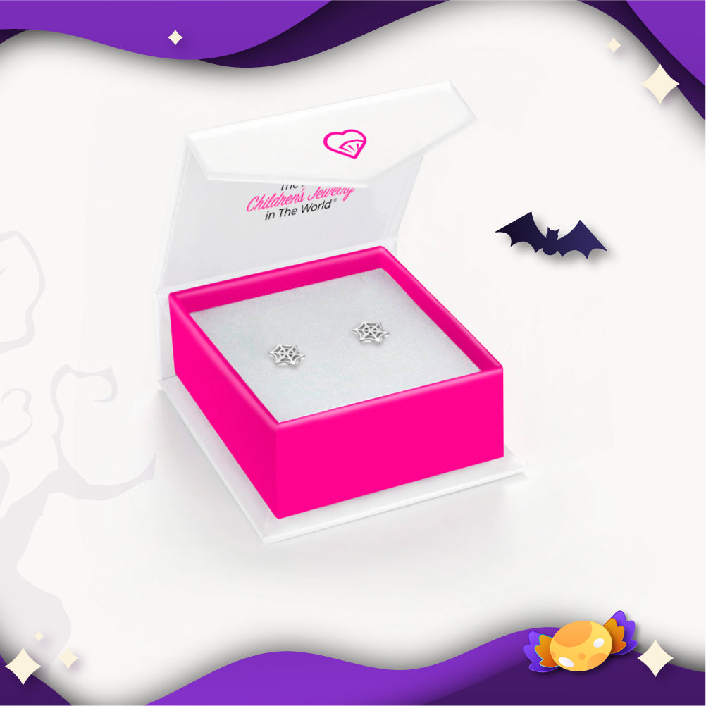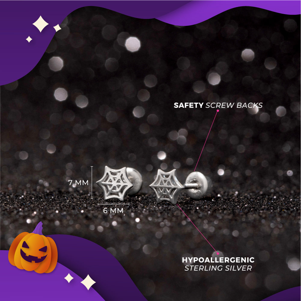 These spooky Halloween earrings are created especially for children, featuring intricate spiderweb designs that add a spooky touch to any outfit. Crafted from polished, hypoallergenic 925 sterling silver, these earrings are gentle on sensitive ears and ensure durability. The safety screw back closures provide extra security, making them a safe and stylish choice for kids during the Halloween season. A small gift box is included with purchase.